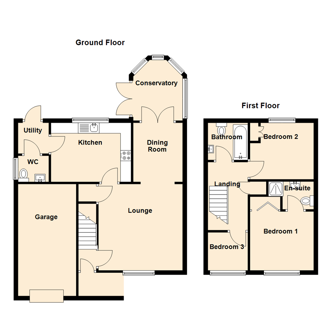 Internally, the property briefly comprises: an entrance hallway leading to a bright and airy lounge, a separate dining room that opens into a sunny conservatory, and a modern kitchen fitted with shaker-style units, complementary work surfaces, and a Belfast-style sink. There is also access to a convenient ground floor WC and a utility area with a door to the outside. Upstairs, the first floor offers three bedrooms, including a main bedroom with an en-suite shower room, along with a stylish family bathroom featuring a shower over the bath. Additional benefits include gas central heating and double glazing throughout.