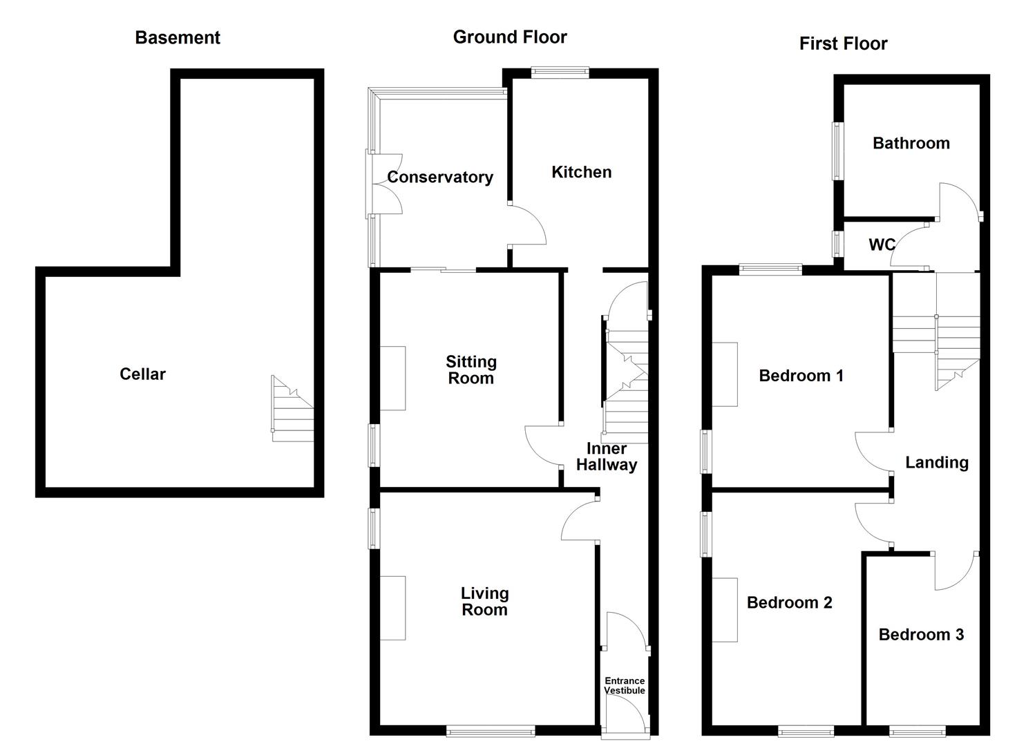 The accommodation briefly comprises a welcoming entrance hall with access to the cellar, living room, sitting room, and kitchen. The kitchen and sitting room both provide access into the conservatory, which in turn leads to the rear garden. To the first floor, the landing gives access to three bedrooms, the house bathroom, a further separate w.c. and loft access. Externally, the property enjoys a planted buffer garden to the front with boundary wall and pathway wrapping around to the rear. The rear garden features a decked seating area and a paved patio, ideal for outdoor dining and entertaining with additional planted borders.