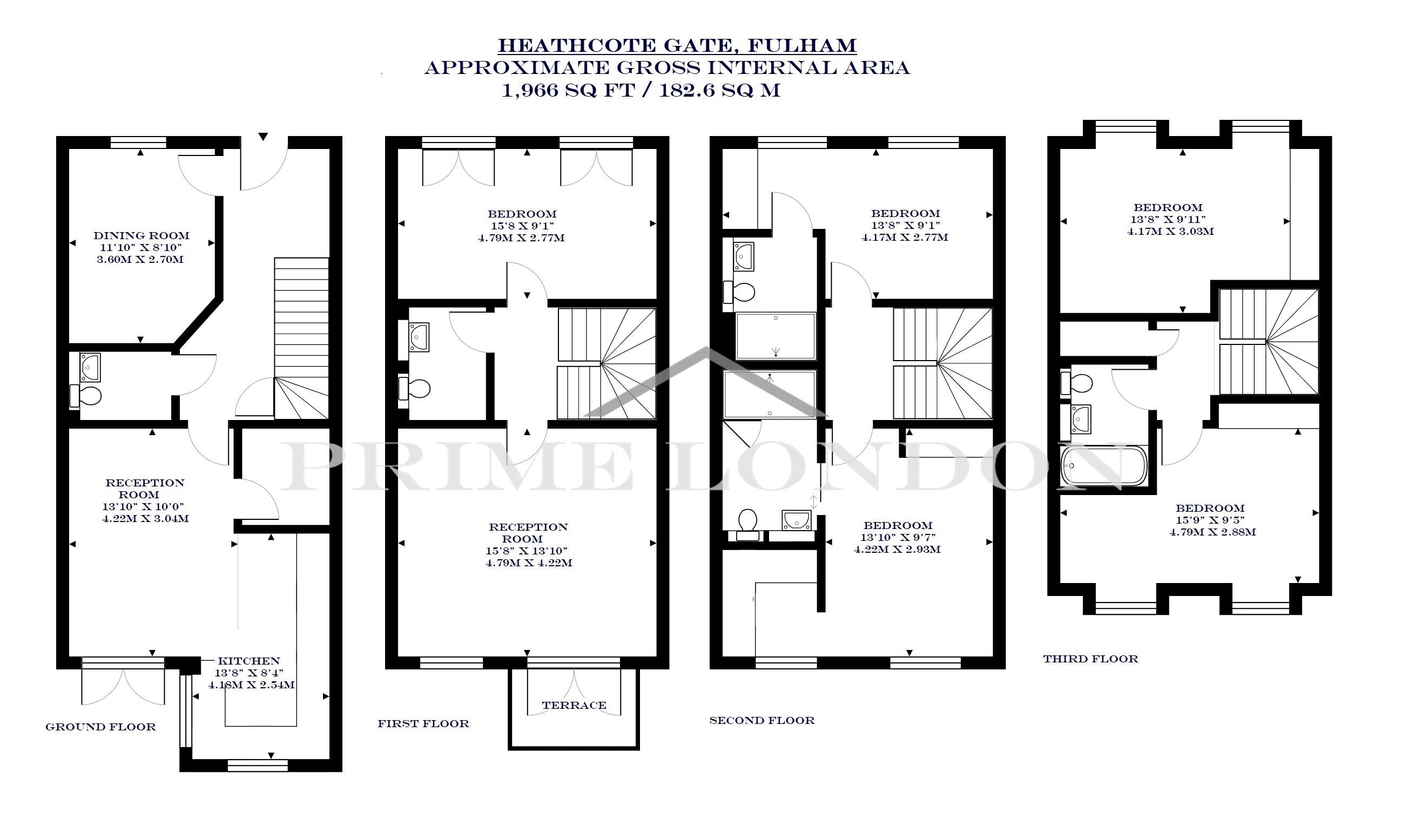Offering 1,966 sq ft / 182.6 sq m of living space, this luxurious house is arranged over four floors, with spacious living areas throughout, including a dressing room to the main bedroom, four further bedrooms, two en-suites and a family bathroom.