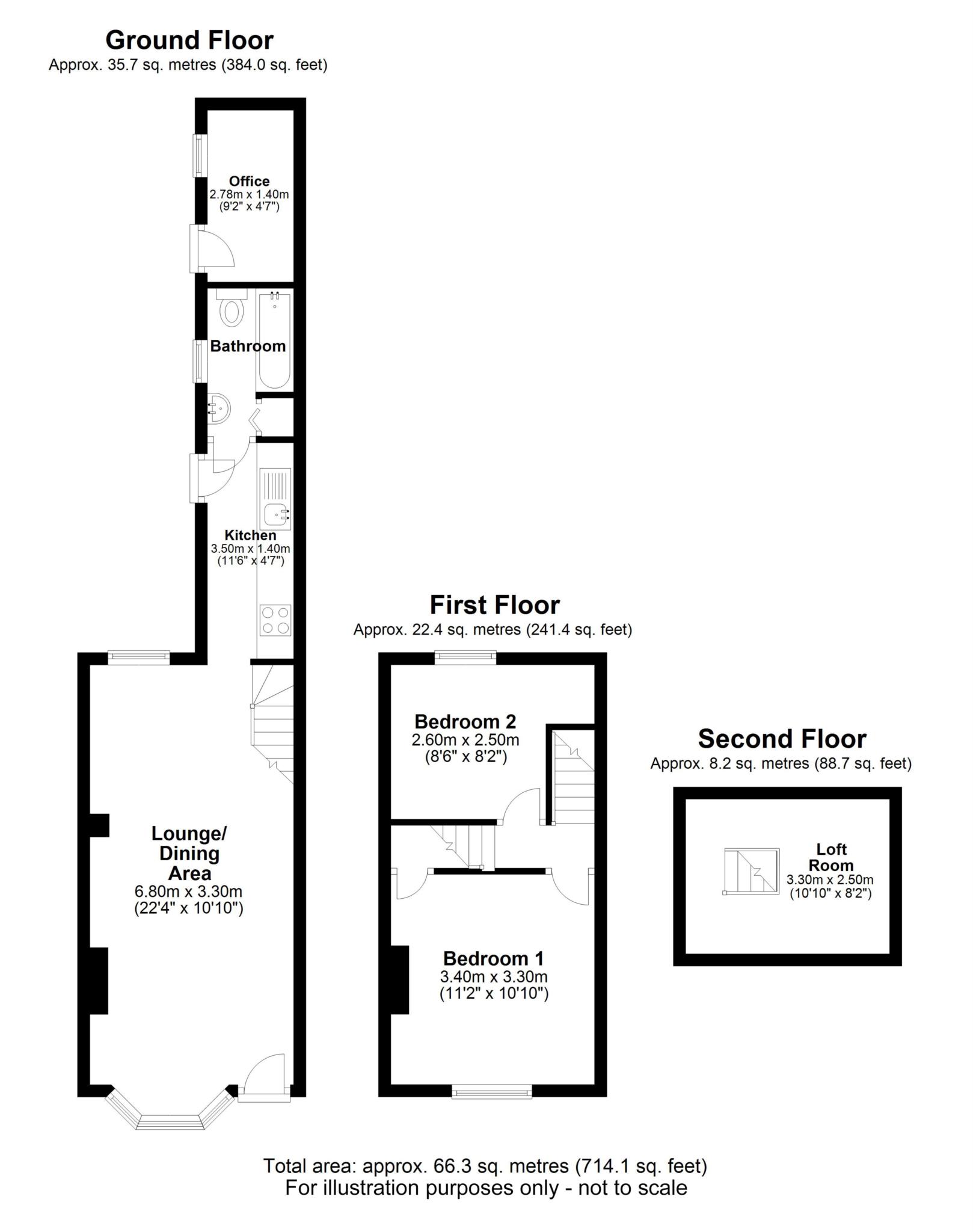The cottage features a large reception room with a fireplace, a modern kitchen, including an electric oven, hob and an extractor, a modern three-piece bathroom with a shower over the bath, an office/study, two bedrooms, and a large loft room for storage. The garden is landscaped and can be accessed from the kitchen.
