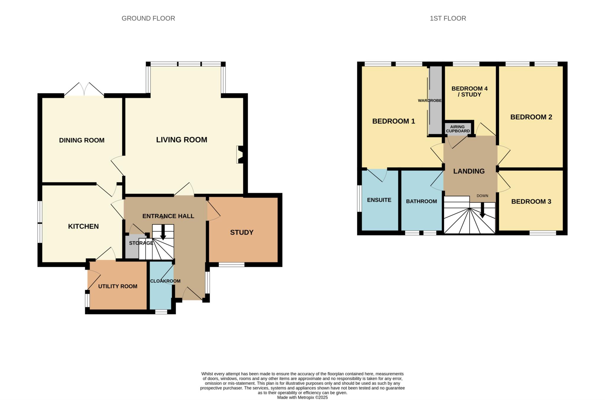 The ground floor offers a bright and welcoming entrance hall, a well sized living room overlooking the rear garden, a separate dining room with French doors leading outside, and a well proportioned kitchen with adjoining utility room. There is also a useful study and a ground floor cloakroom.