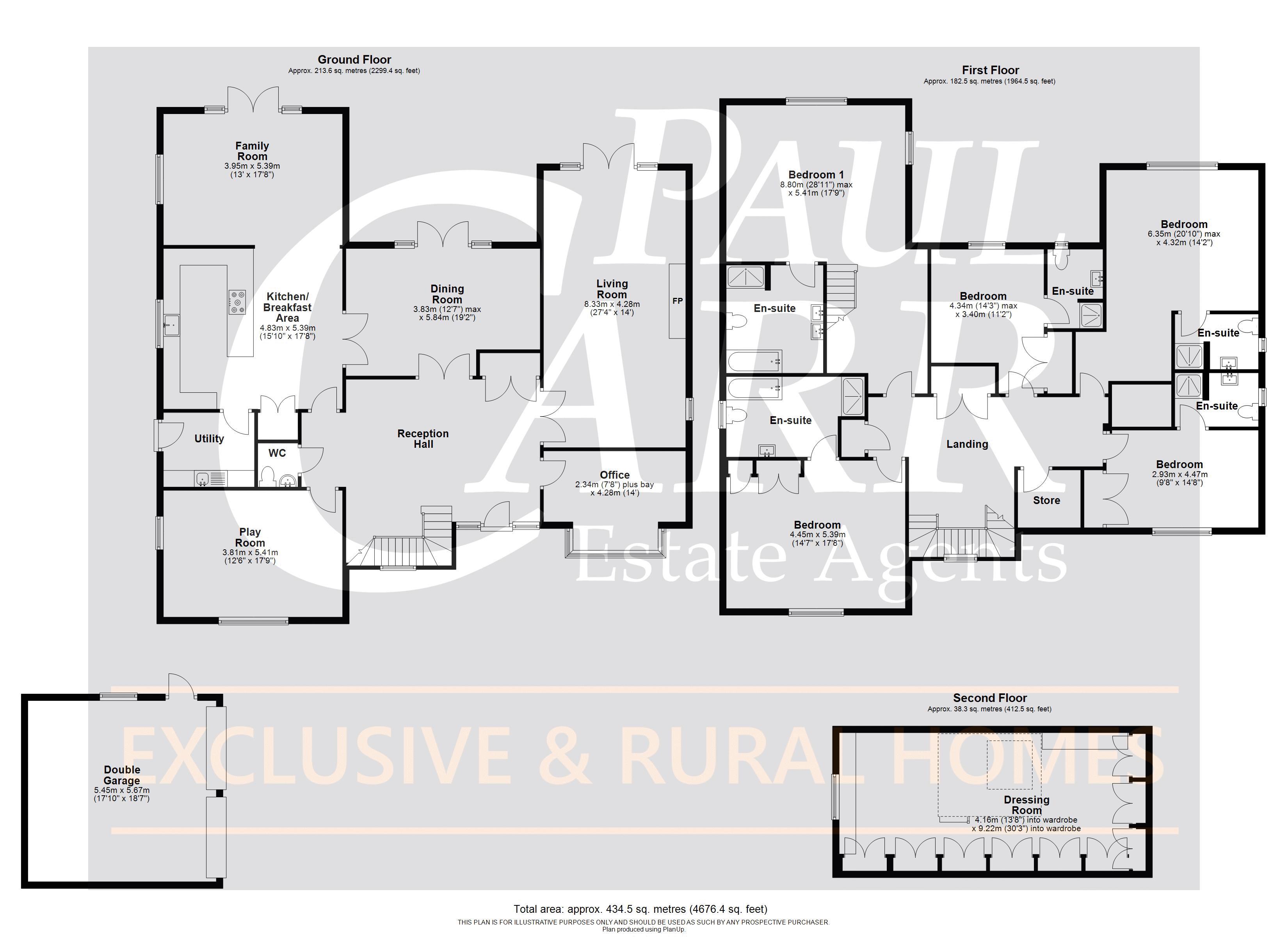 The first floor is just as impressive as the ground floor with a spacious landing leading to the bedrooms and a large store room. The principal bedroom suite is a masterpiece. With windows to the rear and side this fabulous room has all the space you could ever want with a stylish en-suite with bath, separate shower, low level wc and twin sinks in vanity unit. A staircase with a stylish glass balustrade leads to the mezzanine dressing room with a range of fitted wardrobes and window to the side. Bedroom two to the front benefits from fitted wardrobes and an en-suite with bath, separate shower cubicle, low level wc and wash hand basin. Bedroom three enjoys views over the rear garden with fitted wardrobes and an en-suite shower room with shower cubicle, low level wc and wash hand basin. Bedroom four to the front also benefits from fitted wardrobes and an en-suite shower room with bedroom five overlooking the rear, again with fitted wardrobes and en-suite shower room.