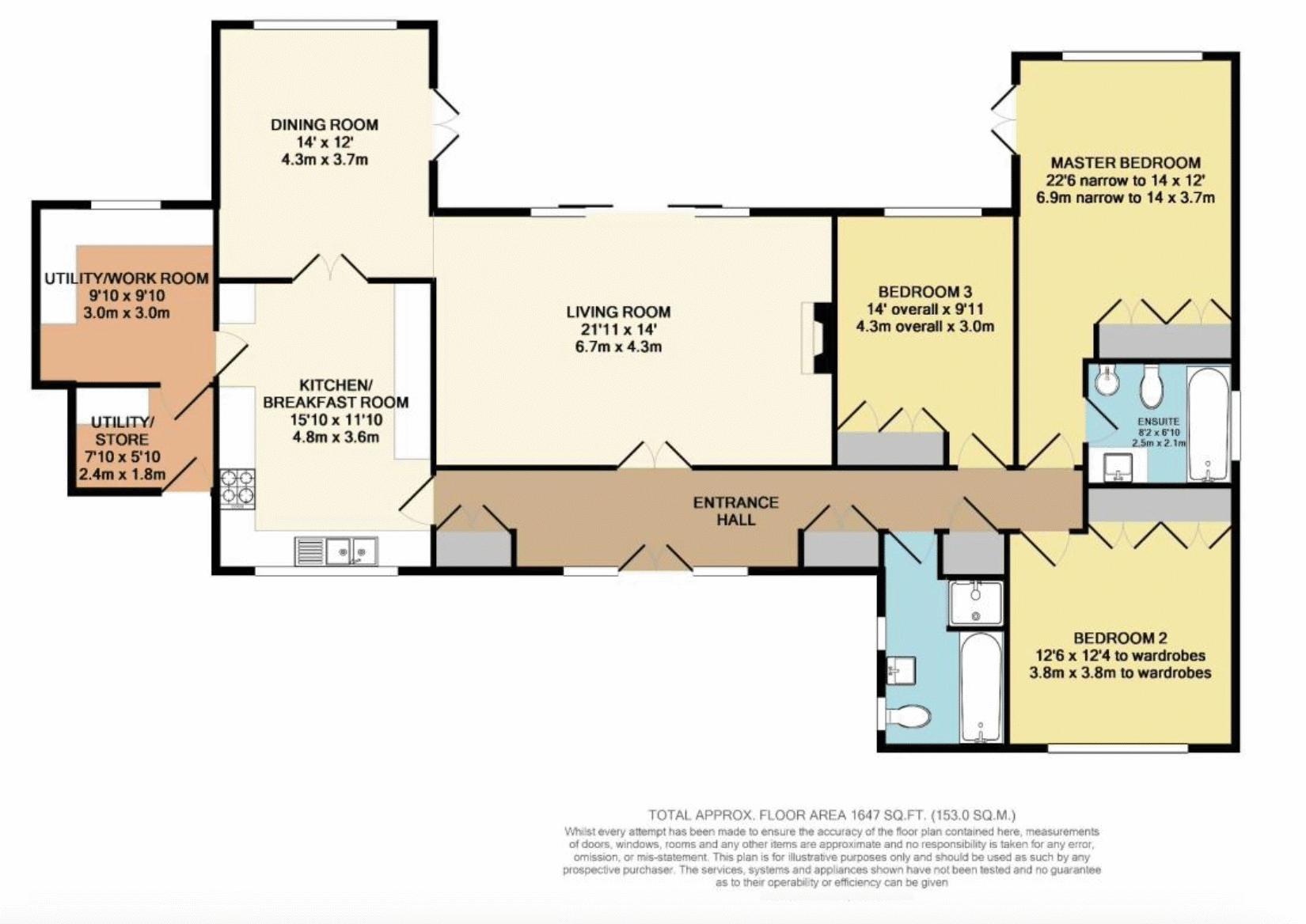 Inside, the bungalow is filled with light and space, with a central reception hall leading to the bedrooms on one side and the well-appointed kitchen, dining room, and utility rooms on the other. The master bedroom features a luxurious en suite bathroom, built-in wardrobes, and French doors opening onto the garden terrace, while the additional double bedrooms offer ample space and storage.