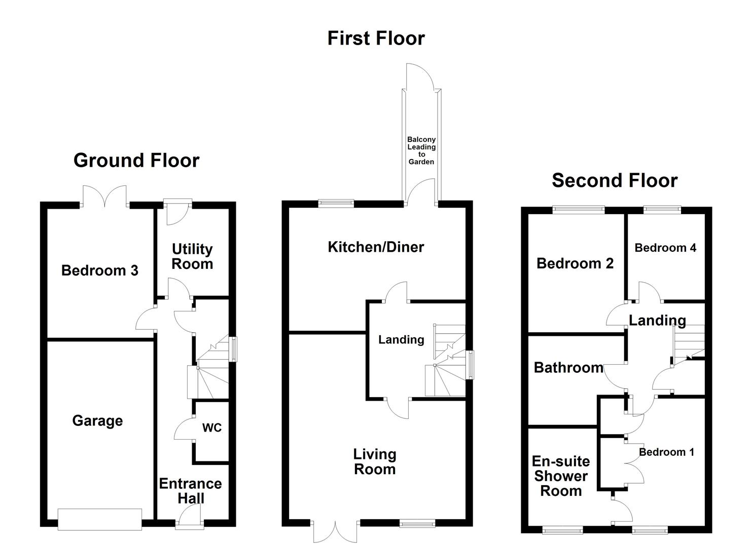 The property briefly comprises of an entrance hall with access to the first floor landing via the stairs, downstairs W.C., utility room and bedroom four. Upstairs, to the first floor is the kitchen diner with access to the rear garden and living room with Juliette balcony. To the second floor landing there is access to three further bedrooms and the house bathroom. Bedroom one benefitting from an en suite shower room. To the front, a slate garden with shrubbery and a block paved driveway offers off road parking for one vehicle, leading to a single integral garage and paved steps to the front door. The tiered rear garden is low maintenance and fully enclosed, featuring a pebbled lower tier, decked steps, and an upper tier with artificial lawn, a decked patio, and access via a balcony from the kitchen diner, ideal for outdoor dining and entertaining.