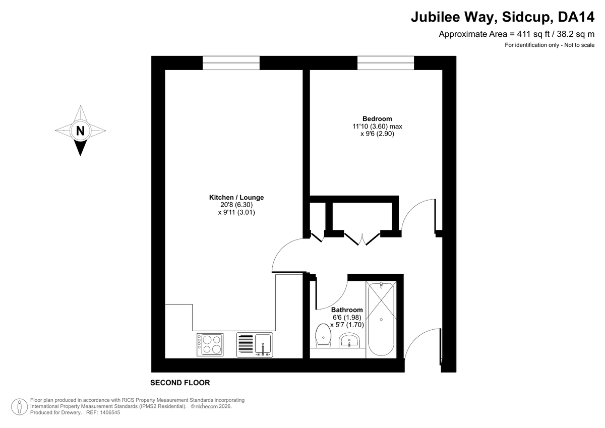 The accommodation briefly comprises a secure communal entrance, private front door, entrance hall, and a bright lounge open-plan to the kitchen. There is a double bedroom, a bathroom, and useful storage with access to the loft. Externally, the property enjoys a garage en bloc and well-maintained communal grounds.