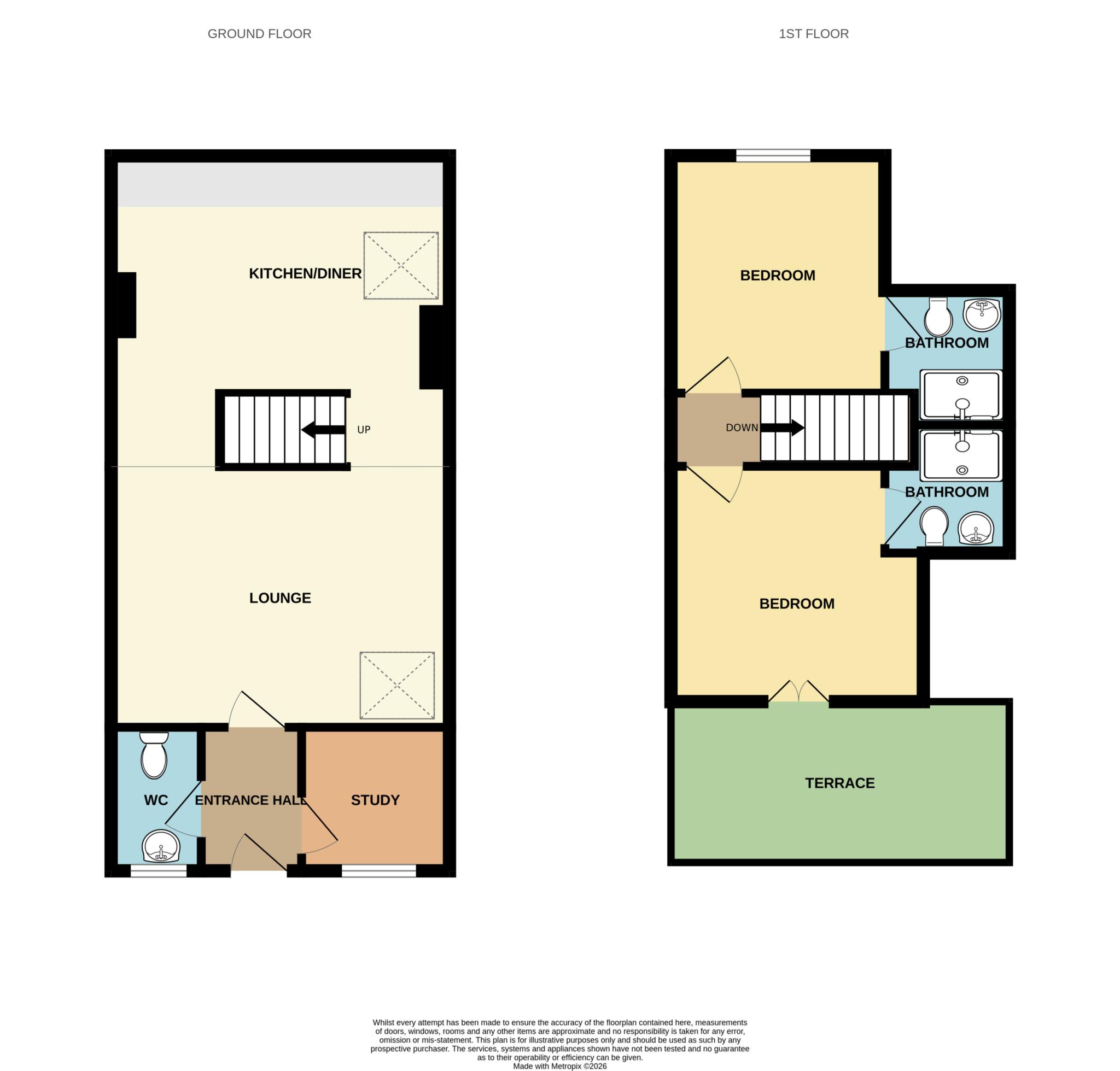 To the first floor, there are two generous double bedrooms, both enjoying fitted wardrobes and window shutters, and each benefiting from its own en suite shower room. These are finished to a high standard with modern white suites, ceramic tiled flooring and heated towel rails. The principal bedroom further enjoys direct access to an impressive balcony and terrace, enclosed with wrought iron railings and enhanced by external lighting, providing a wonderful private outdoor retreat.