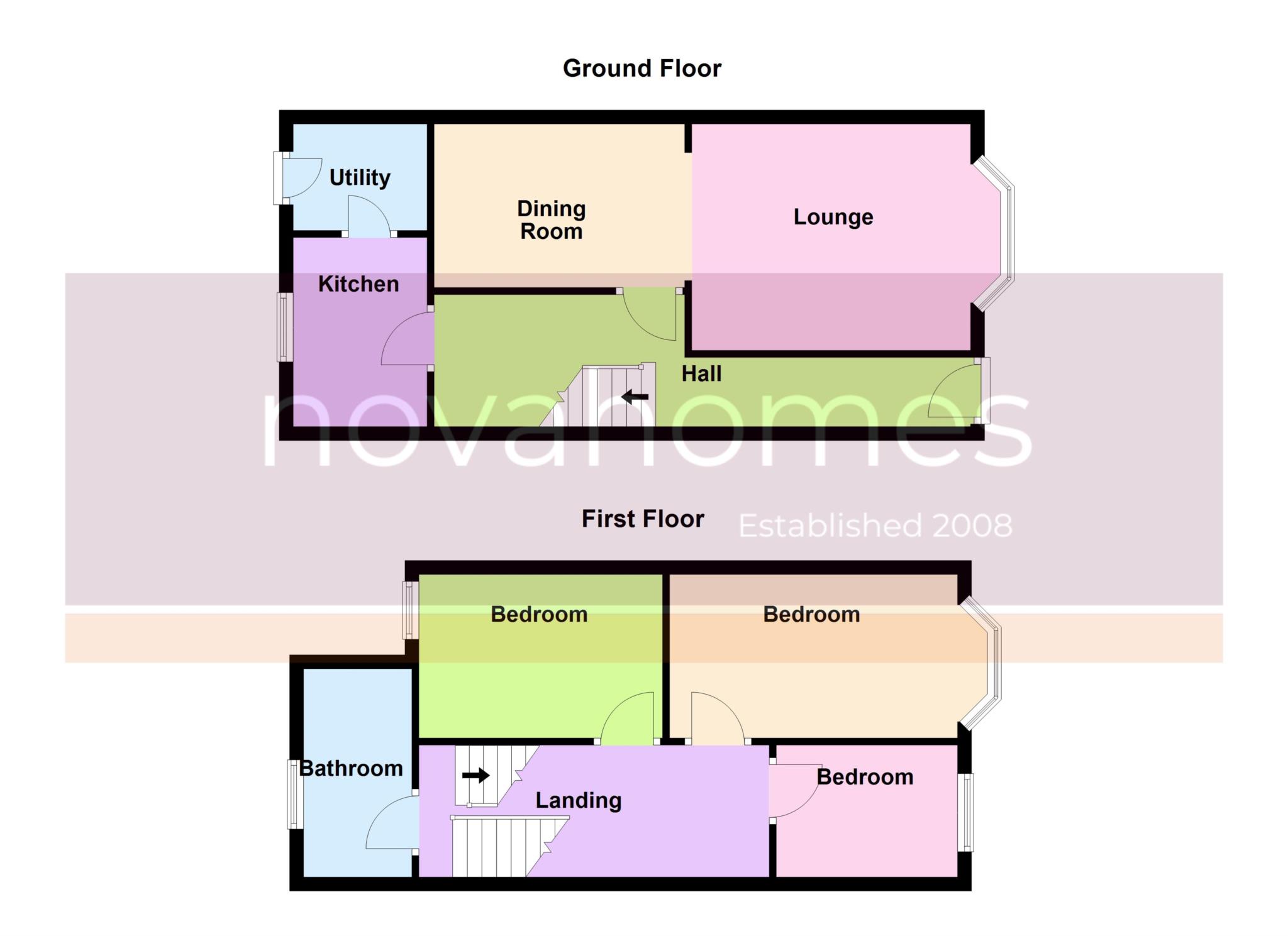 Internally, the layout comprises a bright lounge with bay window that flows through to a formal dining room complete with built-in shelving and a stone-effect fireplace. To the rear, a kitchen and separate utility space offer access to the garden and could easily be reconfigured to suit modern lifestyles. Upstairs, there are three well-proportioned bedrooms and a spacious family bathroom, all requiring cosmetic updating.