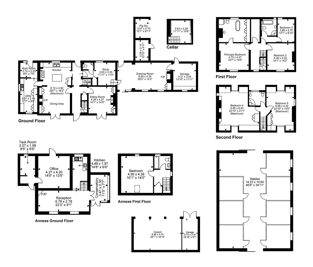 The main reception room is situated to the rear, enjoying garden views and featuring a stone fireplace and another French door. Next to this is a characterful study with a brick floor and bespoke fitted shelving. A couple of steps lead up to the second reception room-a remarkable 28-foot vaulted space with ample glazing that frames views of the garden and countryside. This room also benefits from direct access to both the front and rear of the property. Completing the ground floor is a cloakroom and a cellar, accessed from the entrance hall.
