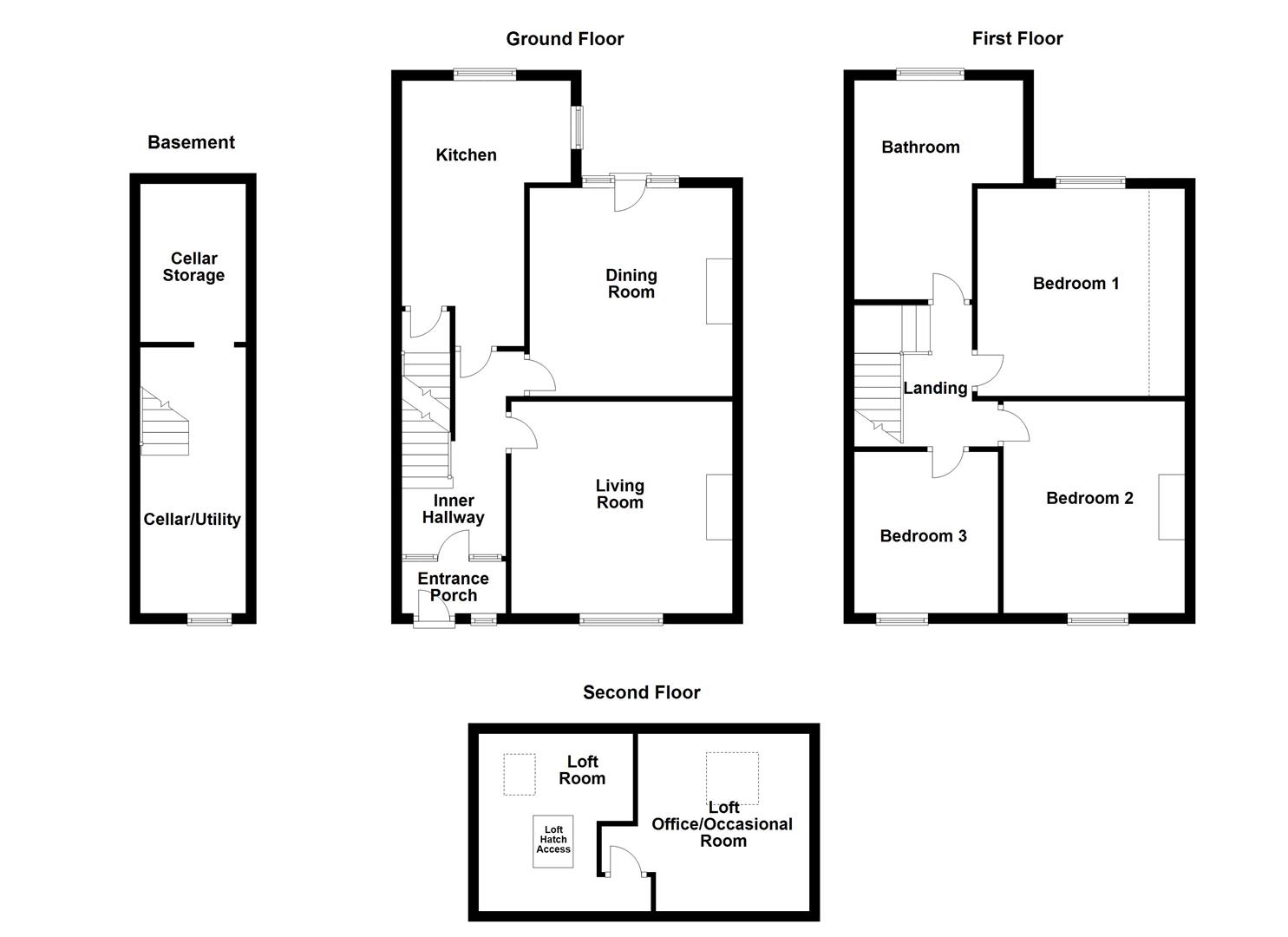 The property briefly comprises porch leading into the entrance hall, living room, dining room and kitchen leading down to two cellar rooms, ideal for storage. The first floor landing leads to three double bedrooms and house bathroom/w.c. with two loft rooms (one currently used as an office). Outside to the front is a small buffer garden with pathway to the front door. To the rear is a lawned garden with paved patio area, perfect for outdoor dining, surrounded by timber fencing.