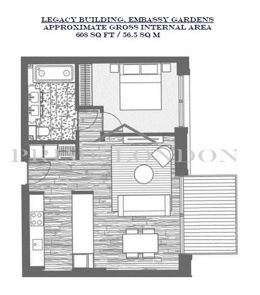 A spacious and excellently furnished one bedroom apartment, with private balcony, on the river side of Embassy Gardens totalling 608 sq ft, available for lease through Prime London. The property comprises an open plan kitchen, dining and living area, double bedroom with built in storage, a family bathroom, and a private balcony. Designed to the highest specification, the apartment boasts high ceilings, wood flooring, private terrace, comfort cooling and abundant natural light. Located on the banks of the Thames and near London's cultural South bank, residents enjoy a wealth of the Capital's finest attractions and amenities practically on their doorstep, and premium residents facilities including an exclusive private club and health spa.