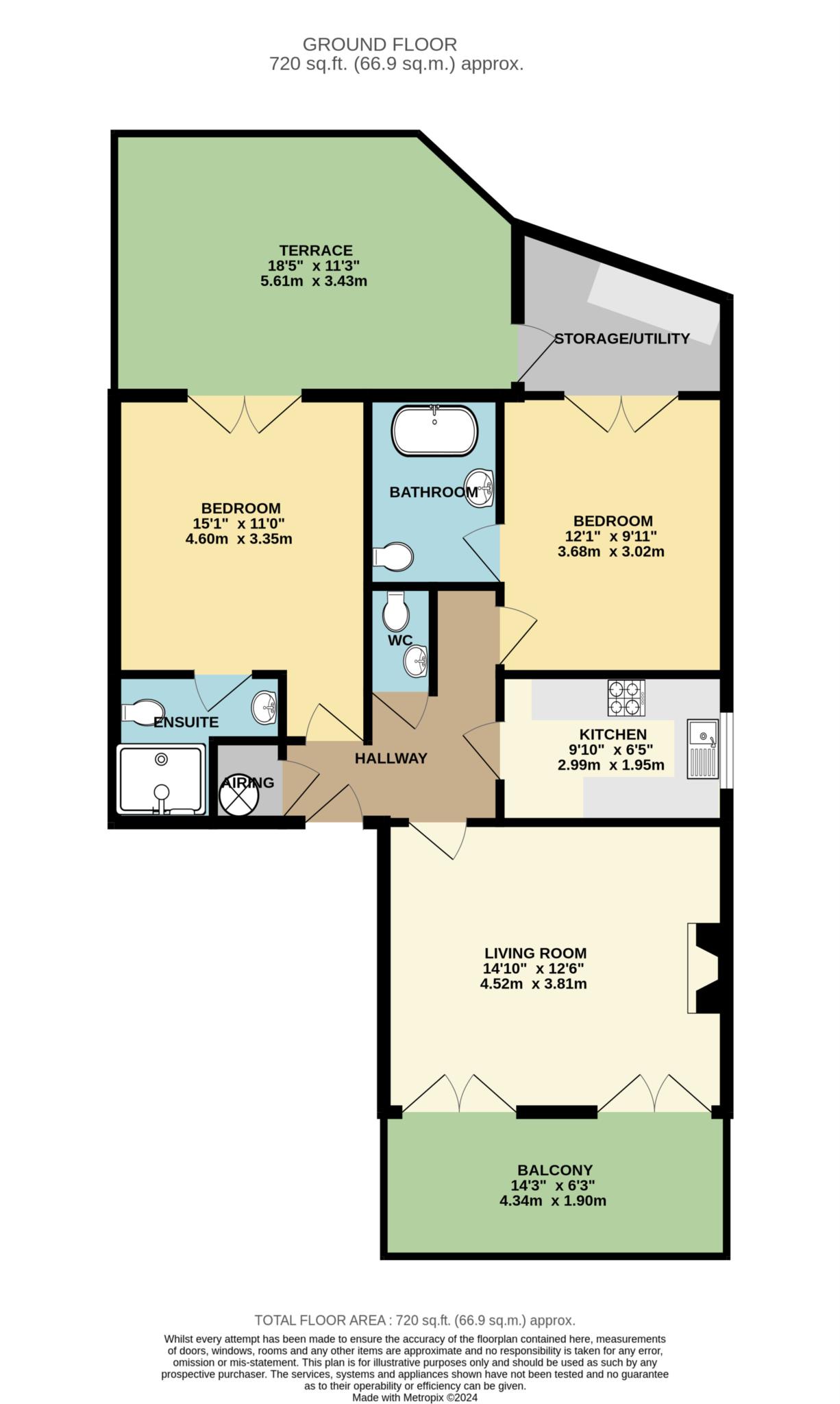Located on the first floor the modern apartment comprises entrance hall with storage and cloakroom, contemporary full fitted kitchen, separate living room with double doors onto the balcony, two double bedrooms both ensuite, utility/storage room and large terrace to the rear of the building which is very private and ideal for pets. The apartment would suit both a young couple/FTB or alternatively make an ideal downsize.