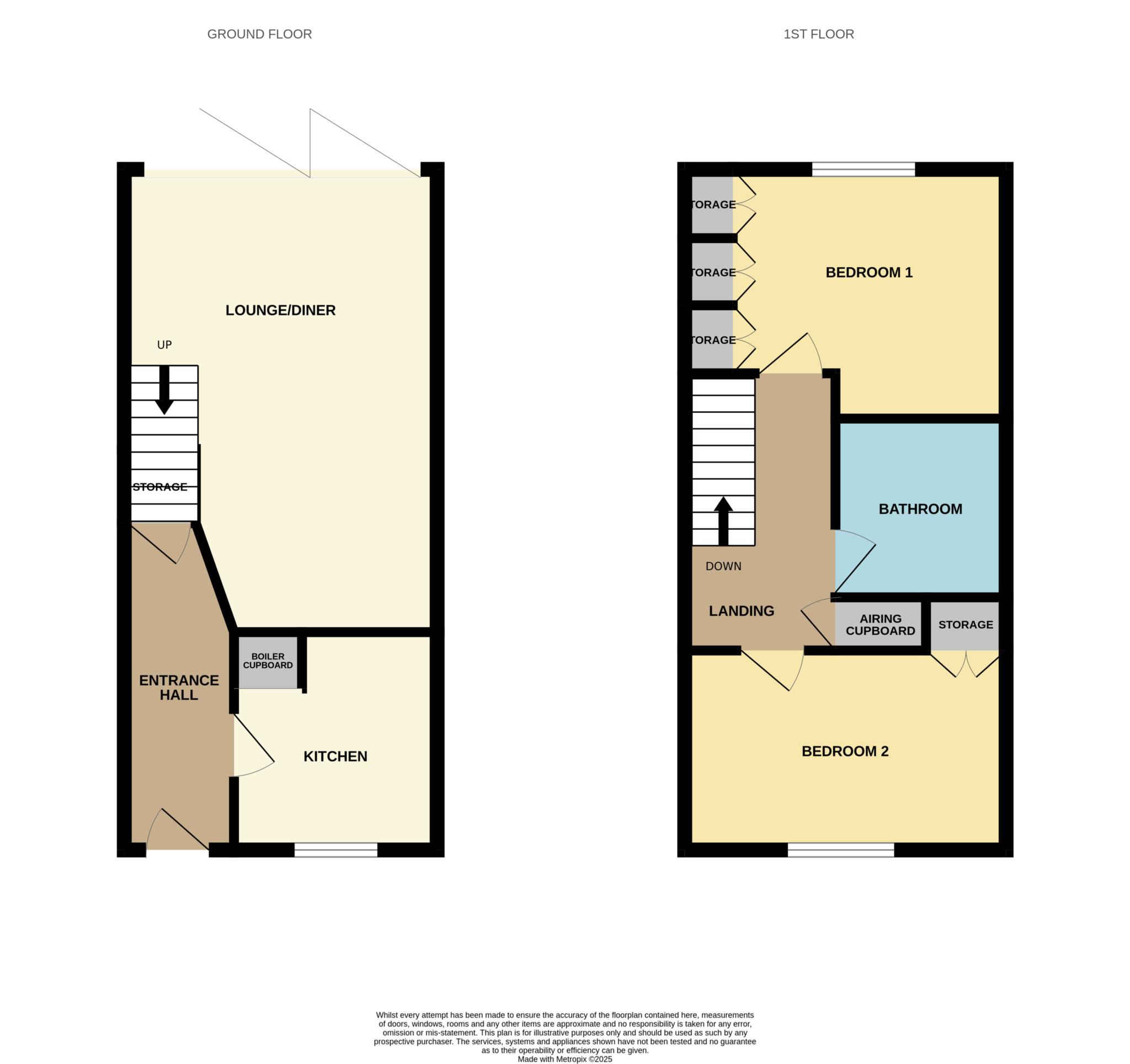 Upstairs comprises two good sized double bedrooms, with the main bedroom benefiting from built in wardrobe storage. The bathroom is finished to a high standard with a contemporary white suite and full tiling. Additional storage is thoughtfully integrated throughout the home, including under stairs cupboards, an airing cupboard and built in storage for both bedrooms.