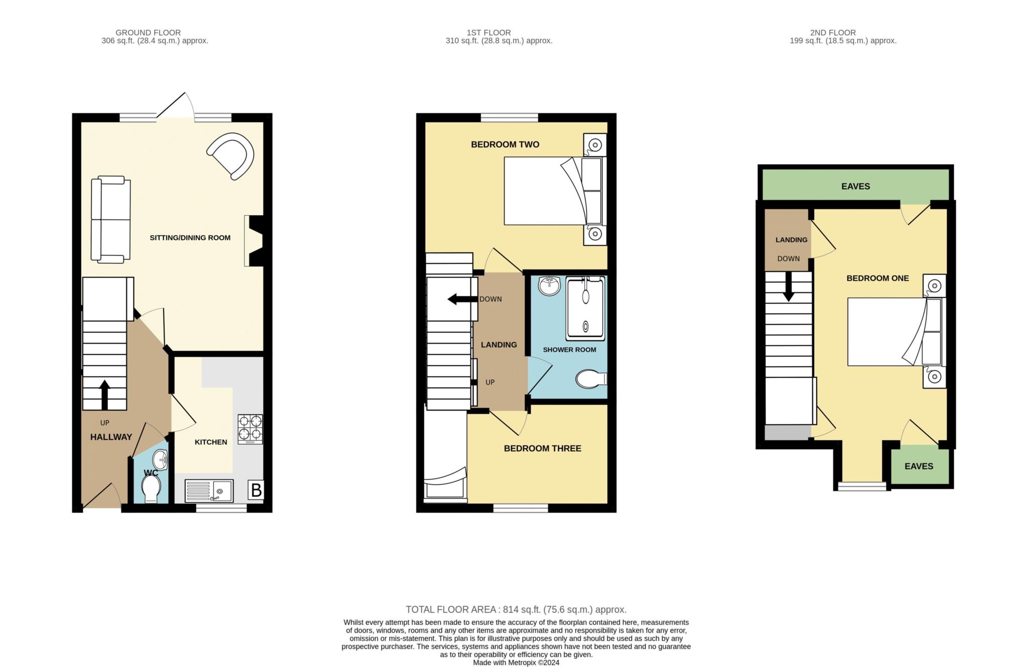 On the first floor is a double bedroom, a smart shower room (no bath) and the third single bedroom/dressing room/study. On the second floor there is an additional twin bedroom with eaves storage.