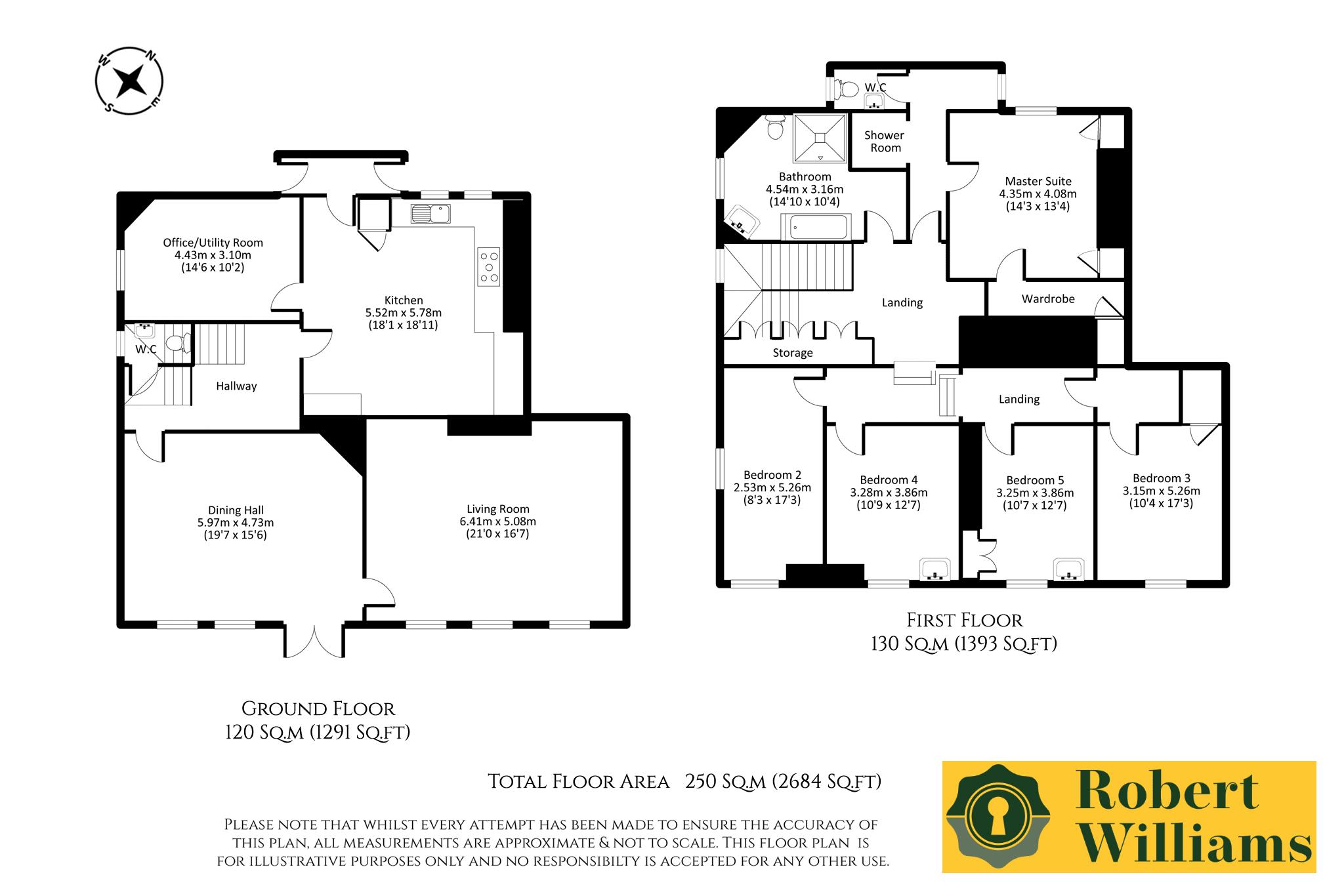 On the first floor landing there are handy built in storage cupboards as well as a feature stained glass window. The master bedroom suite comprises a large double bedroom with walk in wardrobe and further built in wardrobes, a newly installed shower room (being completed mid March) and WC. There are four further double bedrooms with views over the gardens. There is potential that two of these rooms could be opened up to create a larger bedroom if desired.