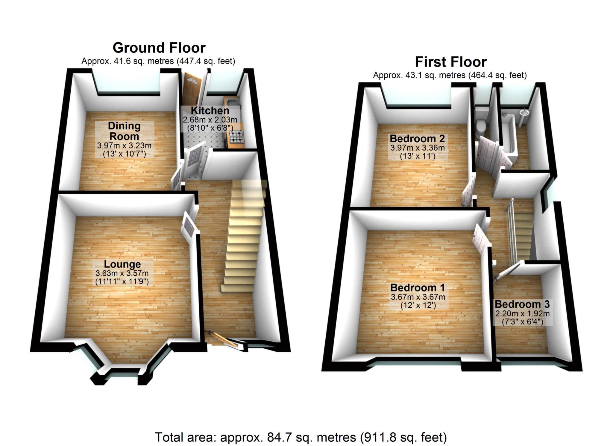 Bathroom - two piece suite comprising of panel bath with over bath shower, hand wash basin, tiled elevation and double glazed window to rear.
