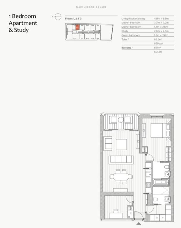 This apartment is spread across 899 sqft and benefits from a study and a balcony.The development borrows an art deco feel with its anodized bronze aluminium and granite retail fade to its ceramic cladding with 4 glaze colours and powder coated aluminium supports and balconies. The cladding will hold concealed lighting to emit a soft glow at night. Internally there is a 6 storey internal atrium lined with plantings of trees and shrubs to create an inner garden similar to the famous Squares of Marylebone but protected from the elements by an apex glass roof and offering a haven to relax and meet your fellow residents.