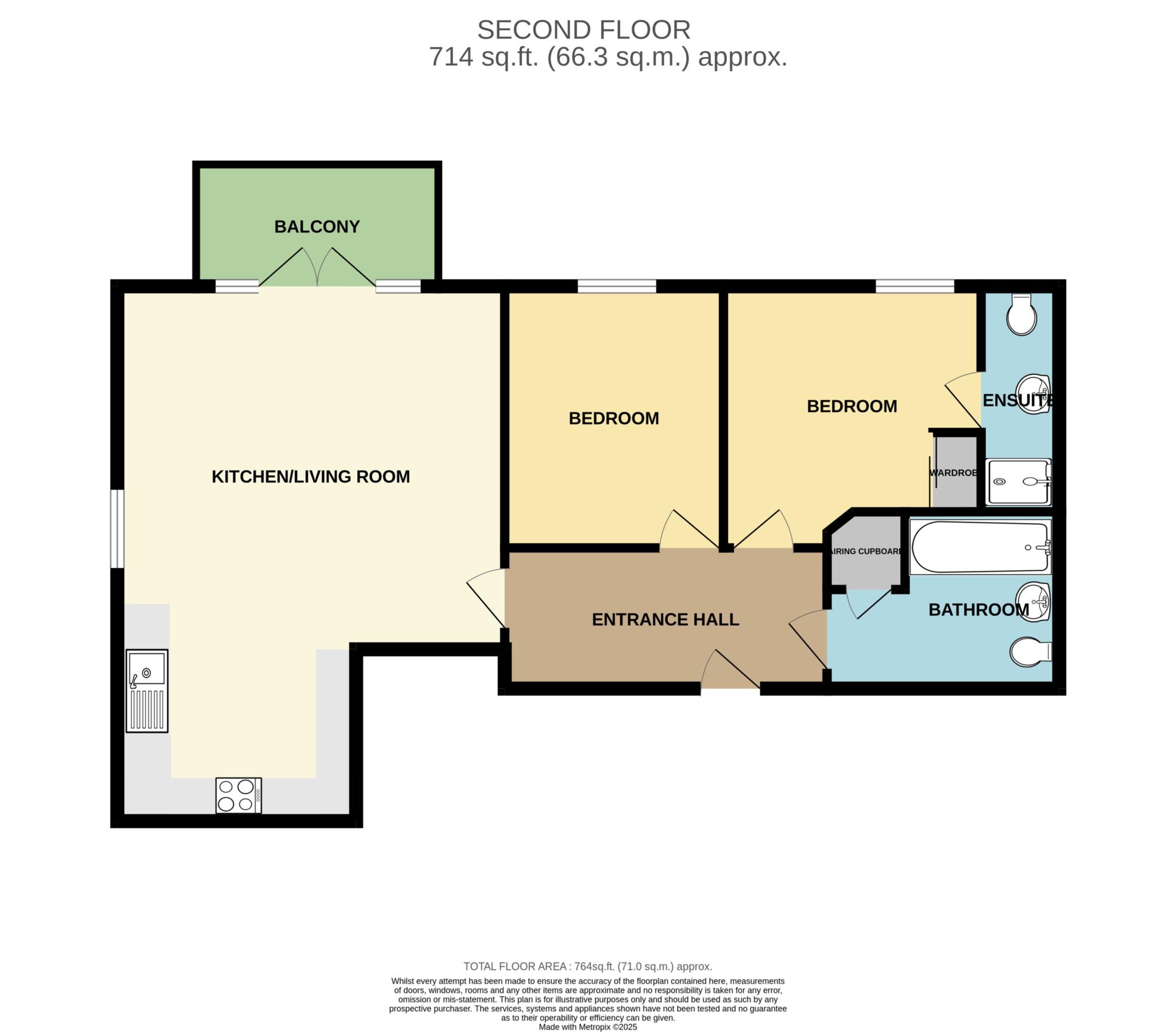 Both bedrooms are good-sized, with wonderful views of the surrounding area. A separate modern bathroom serves the remainder of the accommodation, and there is an abundance of built in storage throughout the flat, including a spacious entrance hallway with storage cupboards.