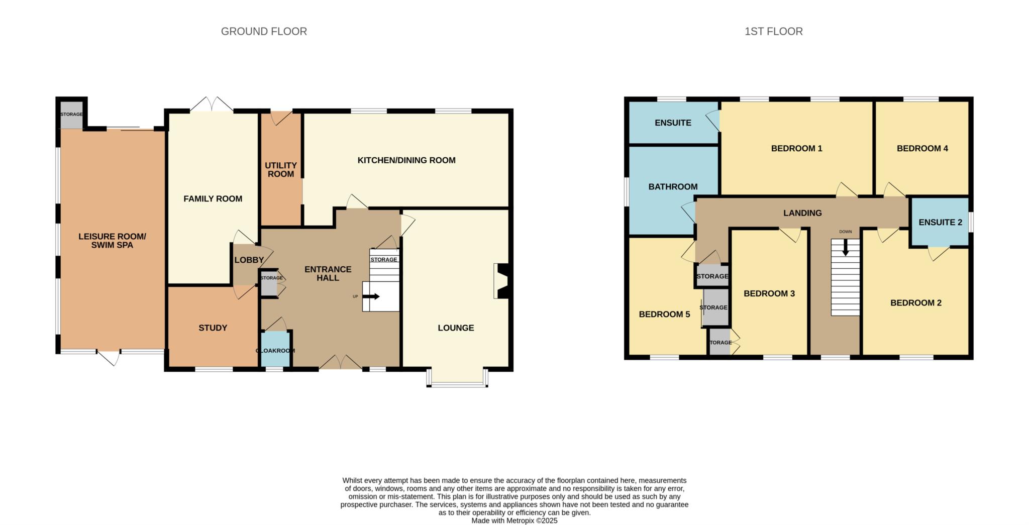 The first floor offers five double bedrooms in total. The main bedroom is served by an ensuite shower room, and a second ensuite can be found in bedroom 2. Three further bedrooms are well proportioned, with bedroom three and five also benefiting from built in storage. The family bathroom is fitted with both a bath and a walk in shower, making it practical for families of all ages. The first floor landing also features a bright seating area with an arched picture window, creating a pleasant spot to relax and enjoy views across the front of the property