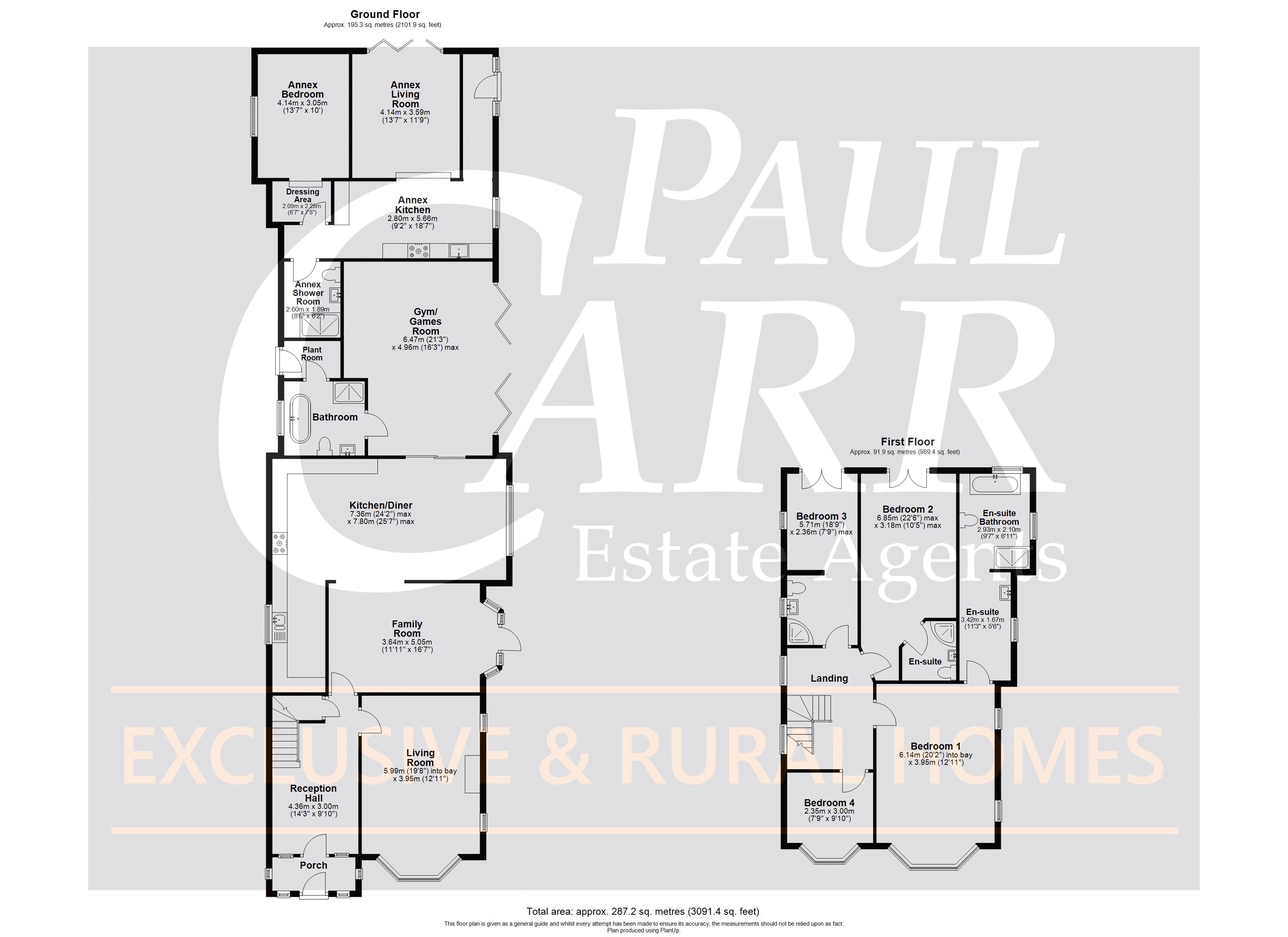 The property benefits from having gardens to the front, side and rear. Lawns to the front and side feature mature shrubs and trees with a driveway providing off-road parking. There are two detached garages, gated side entrance with cold water tap and outside power supply. To the rear, electric gates open to a second driveway which leads to the annex. To the rear of the annex is a private, low maintenance garden with artificial lawn and patio area.
