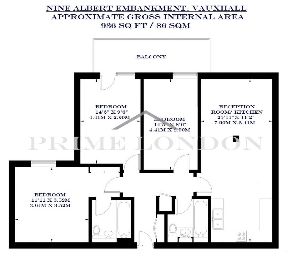 This 936 sq ft / 86 sqm three bedroom apartment is available for lease in Nine Albert Embankment through Prime London.