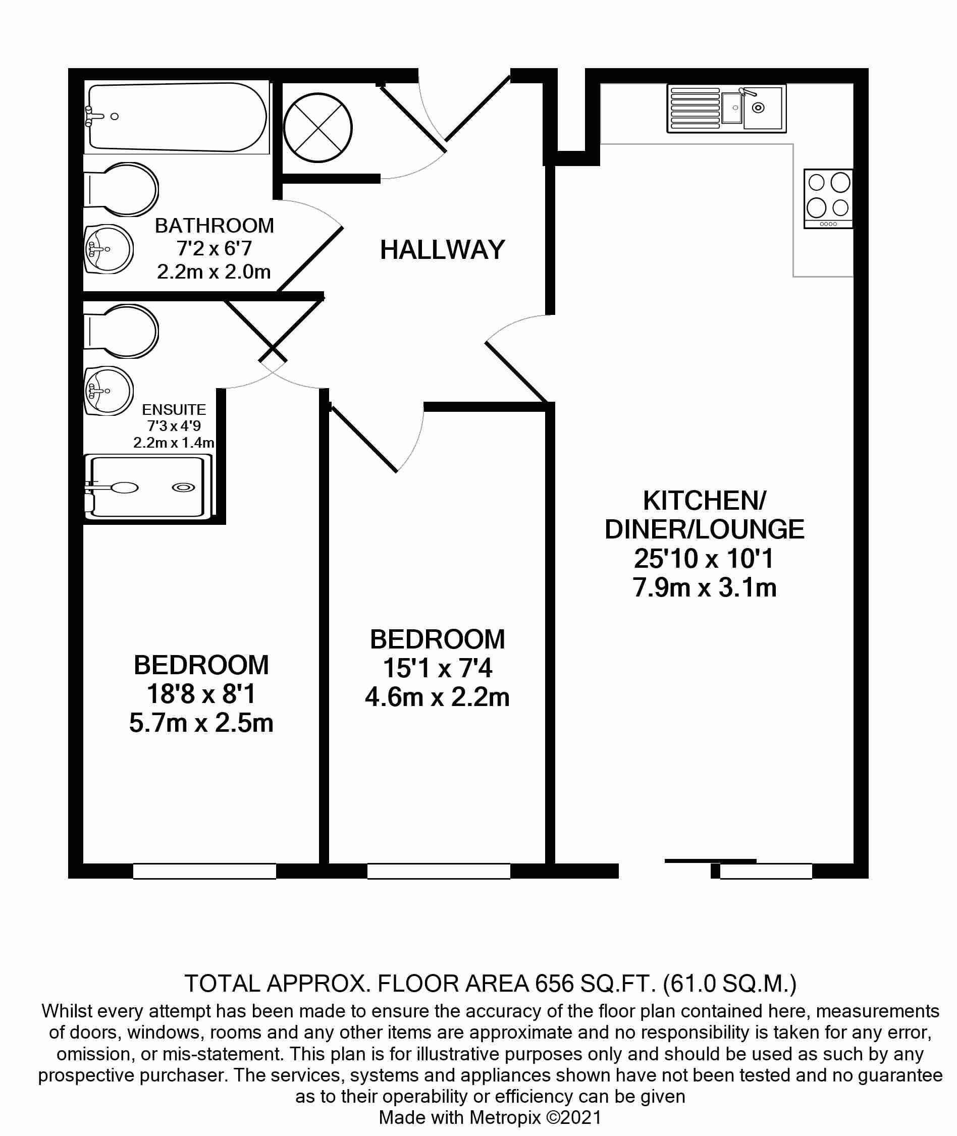 Property briefly comprises: entrance/hallway with storage cupboard; open plan lounge/diner with access to balcony; fully integrated kitchen with appliances; master bedroom with access to en suite bathroom; second double bedroom; bathroom.