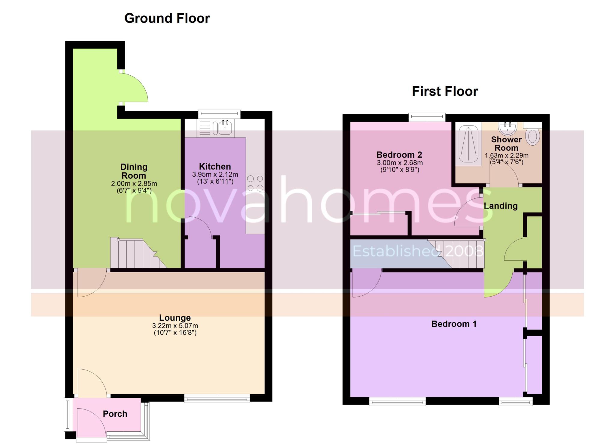 Upstairs, the home boasts two generously sized bedrooms, including a particularly spacious principal bedroom with built-in wardrobes and dual windows. A bright, shower room completes the first-floor accommodation.