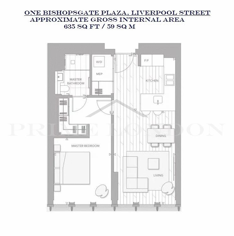 This well appointed 635 sq ft / 59 sq m apartment comprises an open plan living space, floor to ceiling glass, marble kitchen worktop, Miele appliances, dressing area and en-suite shower room.