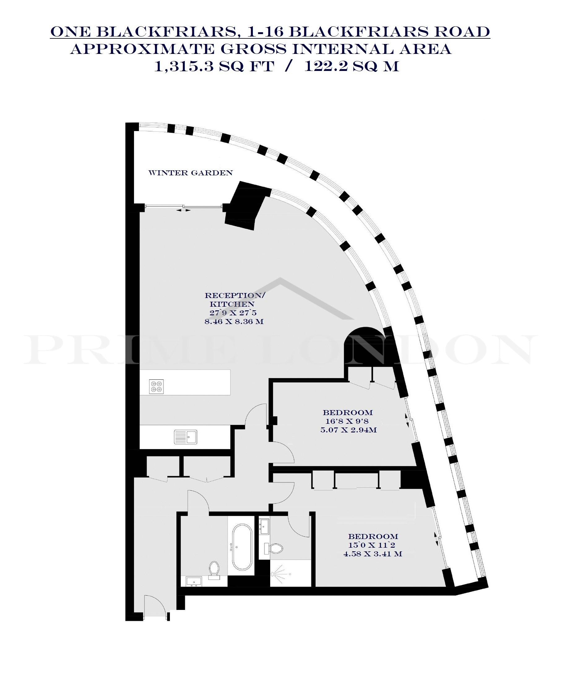 This premium prow style two bedroom apartment of 1,315 sq ft / 122.2 sq m, set in a river facing position of the stunning One Blackfriars development, is available for chain free sale through Prime London.