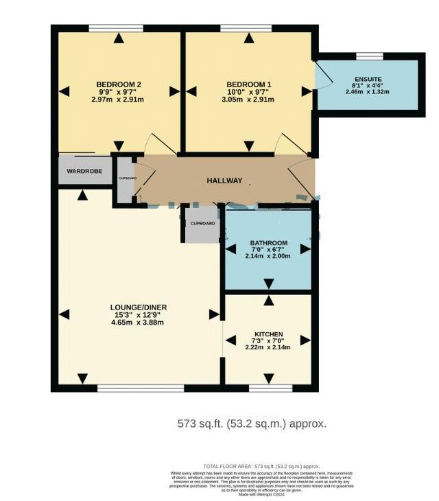 Entrance Door Leading to:Hallway:Entry phone system. Radiator. Power point. Telephone point. Storage cupboard. Cupboard with boiler housing. Laminate flooring.Lounge/Diner4.65m at max x 3.89m at max - Double glazed window to front aspect. radiator. Power point. TV point. Laminate flooring.Kitchen: 2.2m x 2.13m (7' 3" x 7' 0")Fitted wall and base units, with roll top worksurface. Double glazed window to front aspect. Tiled floor. Stainless steel drainer/sink. Pluming for washing machine. Power point.Bedroom One: 3.05m x 2.92m (10' 0" x 9' 7")Double glazed window to rear aspect. Radiator. Power point. Laminate flooring.Ensuite Shower Room:Double glazed window to rear aspect. Enclosed panelled shower cubical with electric shower unit. Hand wash basin. Low level WC. Tiled floor.Bedroom Two: 2.97m x 2.92m (9' 9" x 9' 7")Double glazed window to rear aspect. Radiator. Power point. Fitted wardrobe. Laminate flooring.Bathroom: 2.13m x 2m (7' 0" x 6' 7")Enclosed panelled bath. Pedestal wash hand basin. Low level WC. Radiator. Tiled walls.