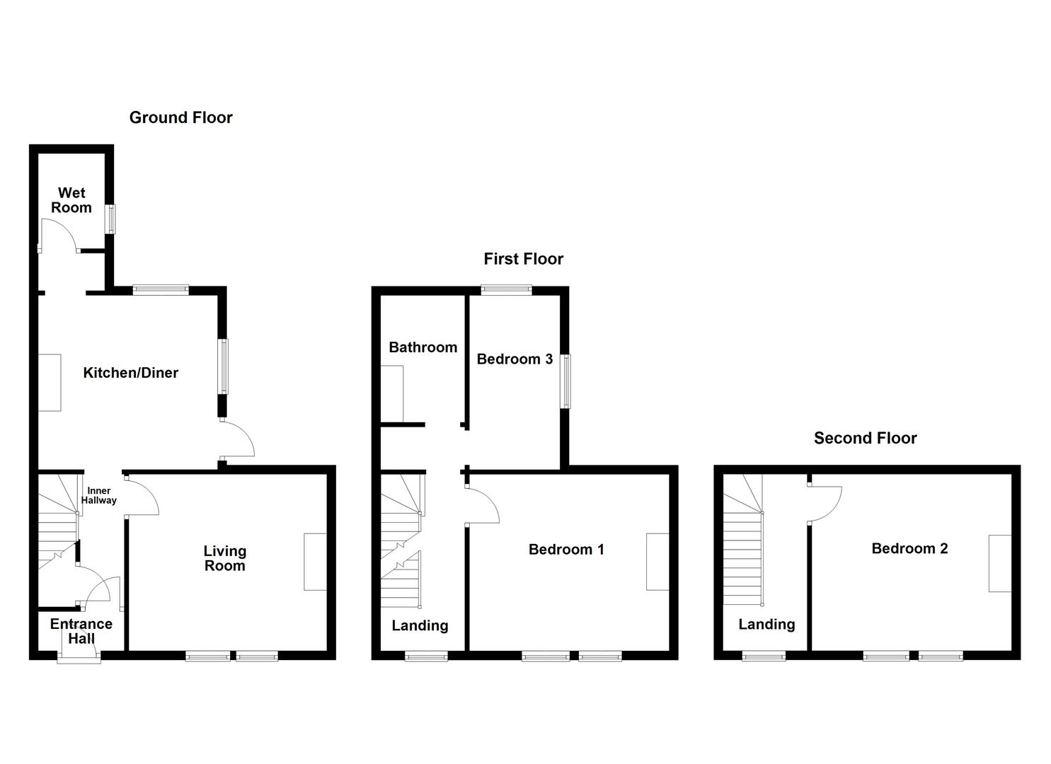 The property briefly comprises of an entrance hall leading to an inner hallway, which provides access to the cellar, the first floor landing, and doors to both the living room and the kitchen diner. The kitchen diner also offers access to the rear of the property and the downstairs wet room. On the first floor landing, there is access to bedrooms one and three, the house bathroom, and stairs to the second floor landing. The second floor landing leads to bedroom two. At the front of the property, there are planted features and a paved pathway to the front door, enclosed by surrounding walls. To the rear, you'll find additional planted features, a paved patio area ideal for outdoor dining and entertaining, and access for those on the terrace to store their bins.