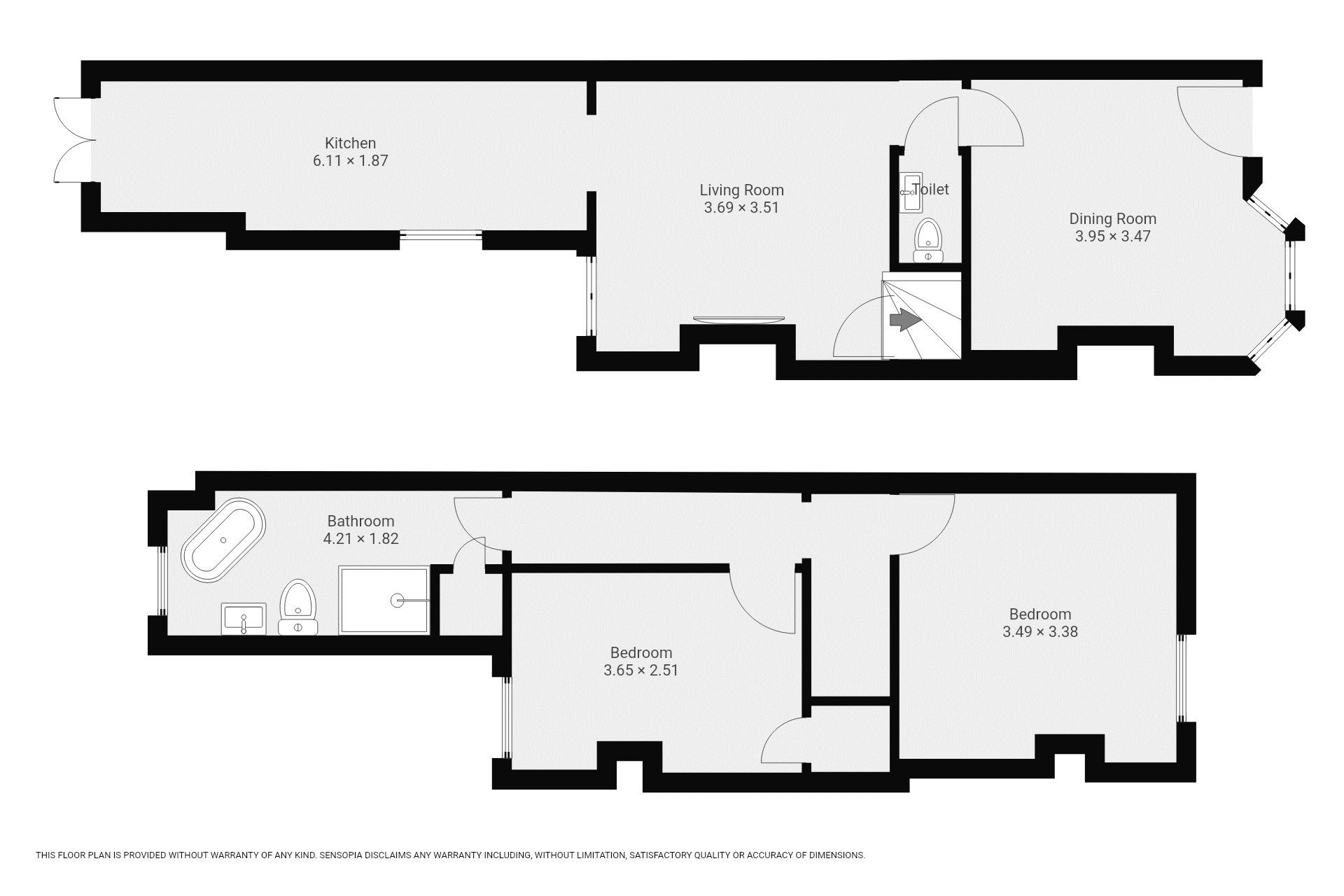 Upstairs, there are two generous bedrooms, each decorated in soft, neutral tones, complemented by a luxurious bathroom with both a freestanding bath and separate walk-in shower — a true spa-style sanctuary.