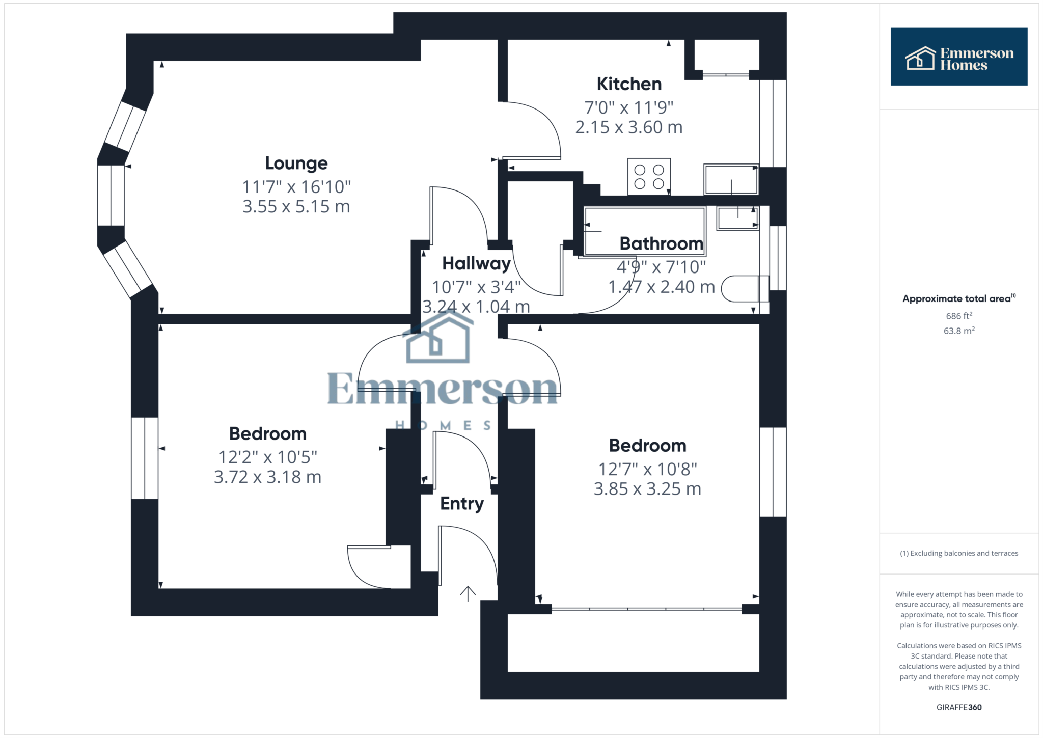 This property comprises an entrance hallway with a large a storage cupboard. The bright and spacious lounge has a bay window to the front of the property. The kitchen is fully fitted with integrated fridge/freezer, washing machine, dishwasher, oven, hob and hood and an excellent selection of floor and wall mounted storage units. The main bedroom is rear facing with three large sliding door cupboards and the second bedroom is front facing with a storage cupboard. The fully fitted bathroom consists of a white three piece coordinating suite, shower over bath with glass screen, w.c and wash hand basin.