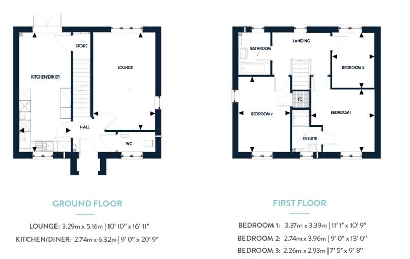The information contained within this page is for general guidance and does not form any part of contract or offer. Design dimensions are subject to construction tolerances and elevational treatments vary between plots. Arrows indicate room dimensions. Purchasers must satisfy themselves of the details of their plot with the Sales Advisor. Imagery and photography is representative only and not plot specific.