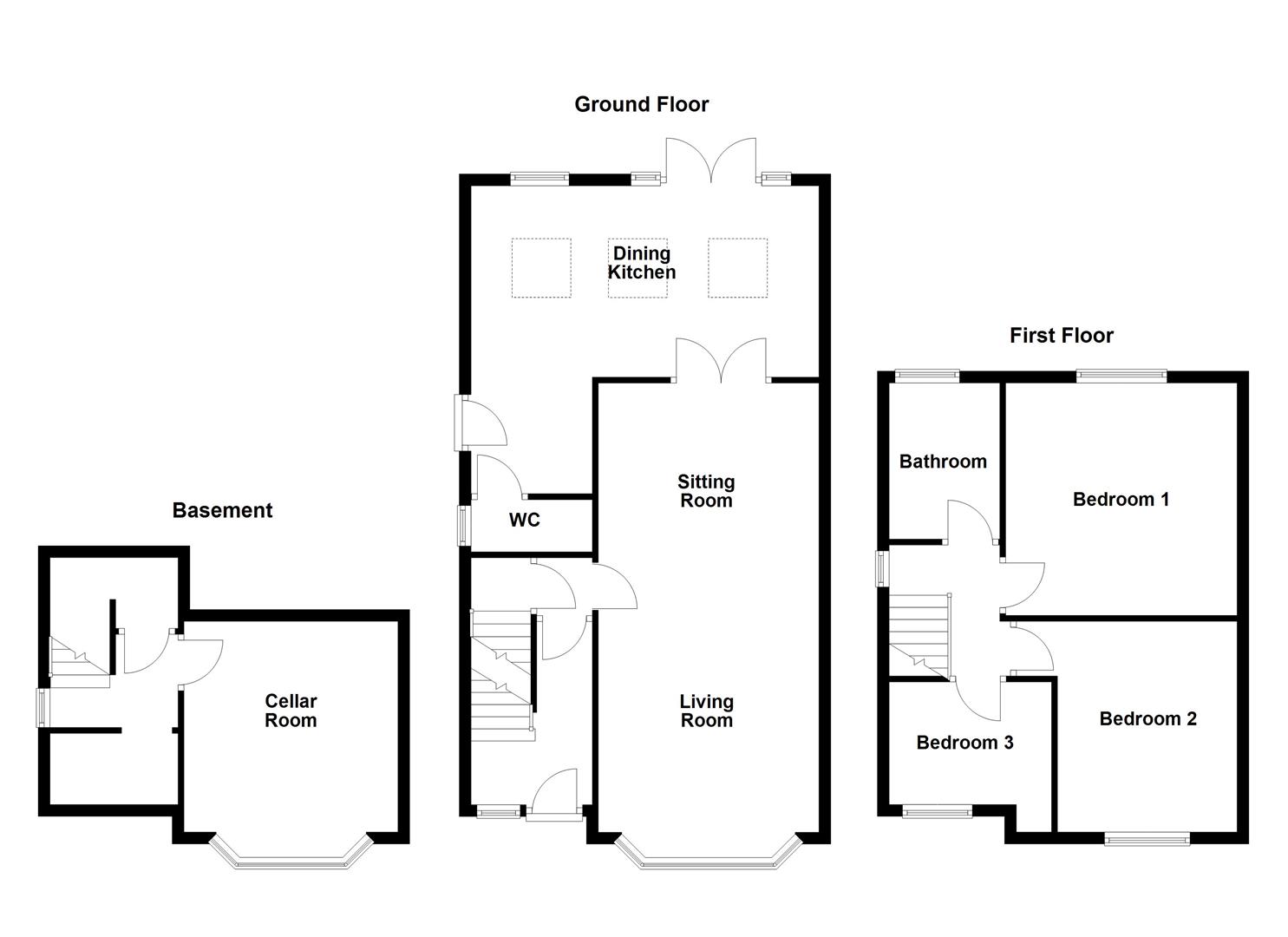 Boasting a gas fired central heating system and double glazed windows, this impressive home is presented with contemporary flair and quality craftsmanship. A welcoming reception hall provides access to the spacious living room, which flows effortlessly into an elegant adjoining sitting area, creating a perfect setting for relaxation and family living. To the rear, the property showcases an outstanding open plan dining kitchen, finished to an exceptional specification with granite worktops, integrated appliances and a stylish breakfast bar. French doors open directly onto the rear garden, seamlessly blending indoor and outdoor living. The ground floor is completed by a modern guest w.c. and access to the cellar level, which offers versatile storage rooms, a boiler room, and a converted double bedroom, ideal for guests or additional living space. The first floor features two generously sized double bedrooms and a well proportioned single bedroom, all served by a luxurious four piece family bathroom finished to a high standard. Externally, the property is approached via a sweeping block paved driveway with additional gravelled parking and well maintained landscaped borders. Gated access leads to further parking at the side of the house and on to the extensive rear garden, which boasts a large stone patio ideal for entertaining, a manicured lawn, and mature trees offering privacy and tranquillity.