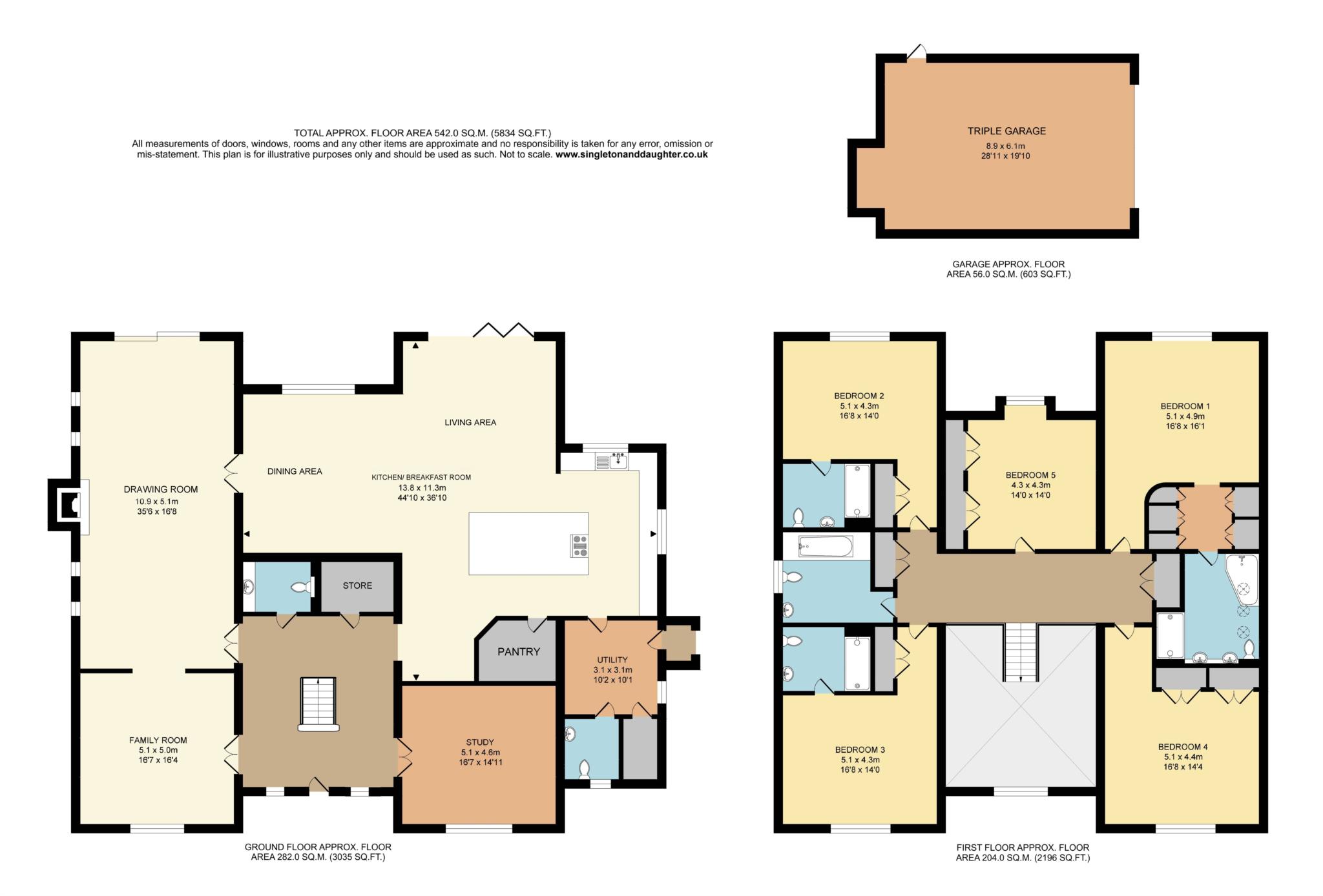 Summary of accommodation: Reception hall, study, two cloakrooms, family room, drawing room, kitchen/dining/living/breakfast room, walk-in pantry, 5 bedrooms, family bathroom, 3 ensuites, dressing room to principal bedroom. Triple garage. Single car port.