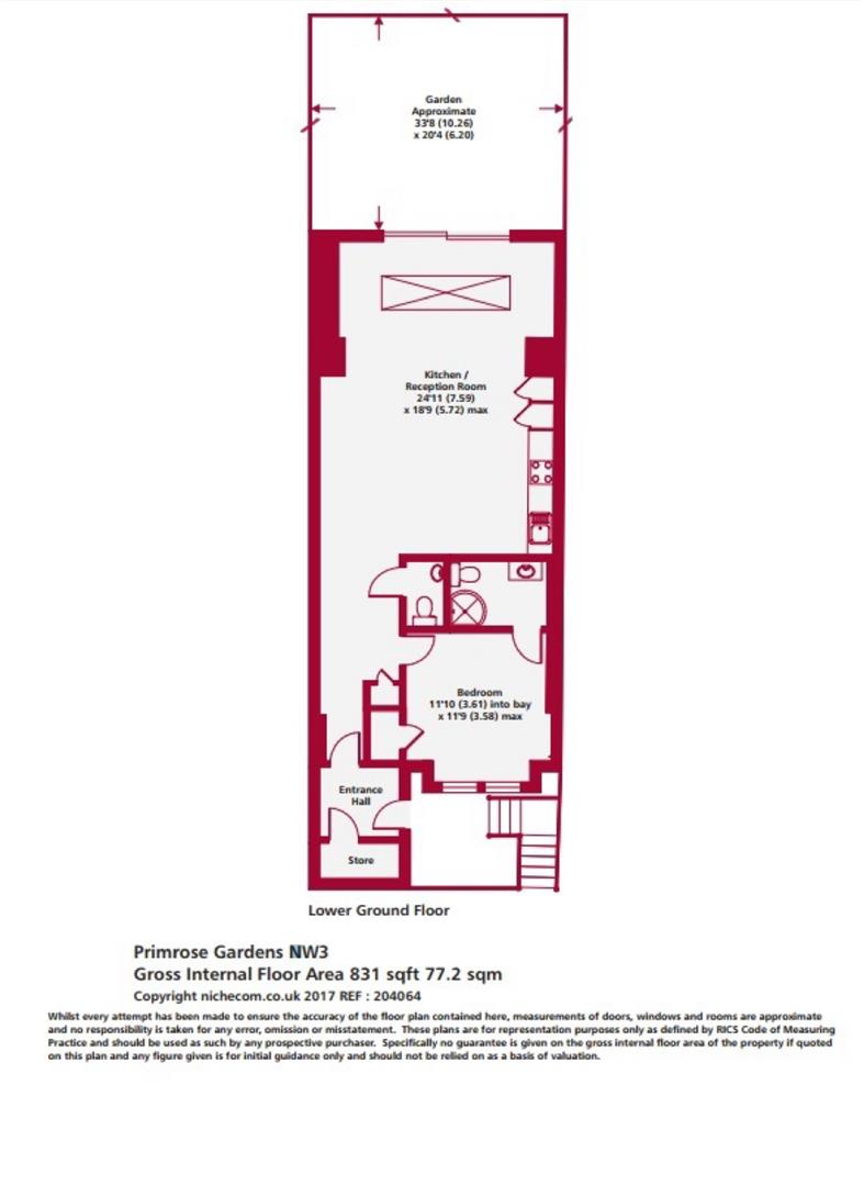 A beautiful and modern one double bedroom apartment located on the lower ground floor of a period conversion. Huge reception area with new open plan kitchen leading out to a lovely private rear garden. Wooden flooring. Separate WC. Double bedroom with en suite shower room. Own entrance. The flat is located on a lovely tree lined street close to Belsize Park. Mostly unfurnished and available 21st July