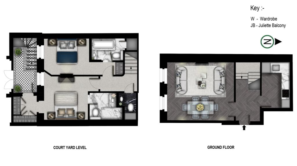 The sophisticated primary bedroom exudes luxury, adorned with exquisite French silk wallpaper. It includes a dressing area and offers access to a private front courtyard, creating an ideal setting for enjoying warm London evenings. The en-suite bathroom is beautifully marbled throughout and features a walk-in shower, mirrored dark oak vanity cabinets, and a Vitra toilet.