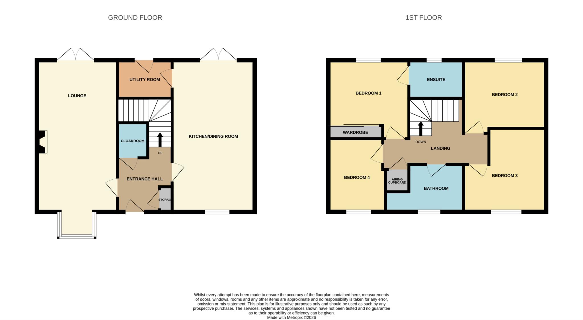 The first floor is arranged around a central landing and comprises four well proportioned bedrooms. The principal bedroom benefits from fitted wardrobes and a contemporary en-suite shower room. Bedroom two and three are generous doubles, with bedroom four providing flexible accommodation suitable for children, guests or home working. A modern family bathroom serves the remaining bedrooms and is finished with quality tiling and a white suite.