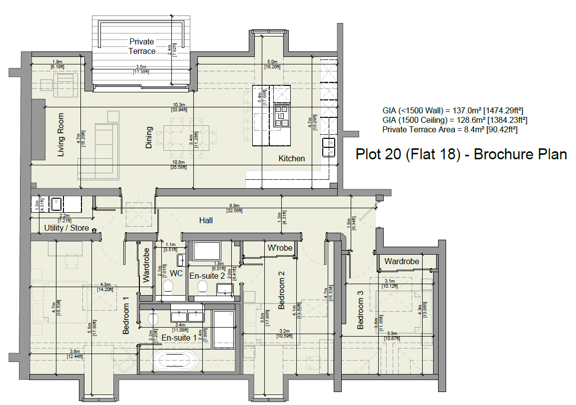 This beautiful penthouse has a gross internal area of 1,565 sq ft and benefits from two very good sized bedrooms with fitted wardrobes,additional storage above wardrobes, two en-suite bathrooms, an additional guest WC,