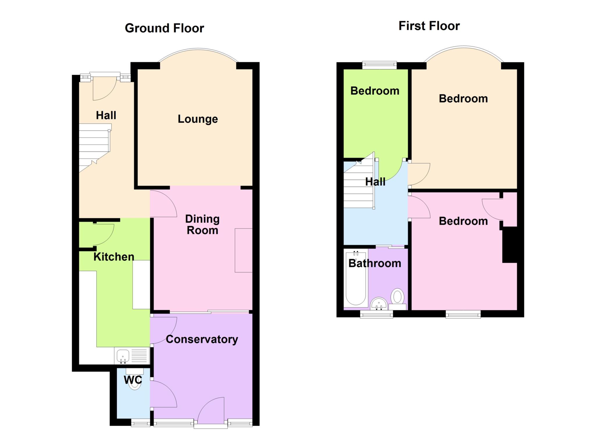 Bath, pedestal hand basin, low level W.C., PVCu double glazed window, tiled walls, access to loft space.