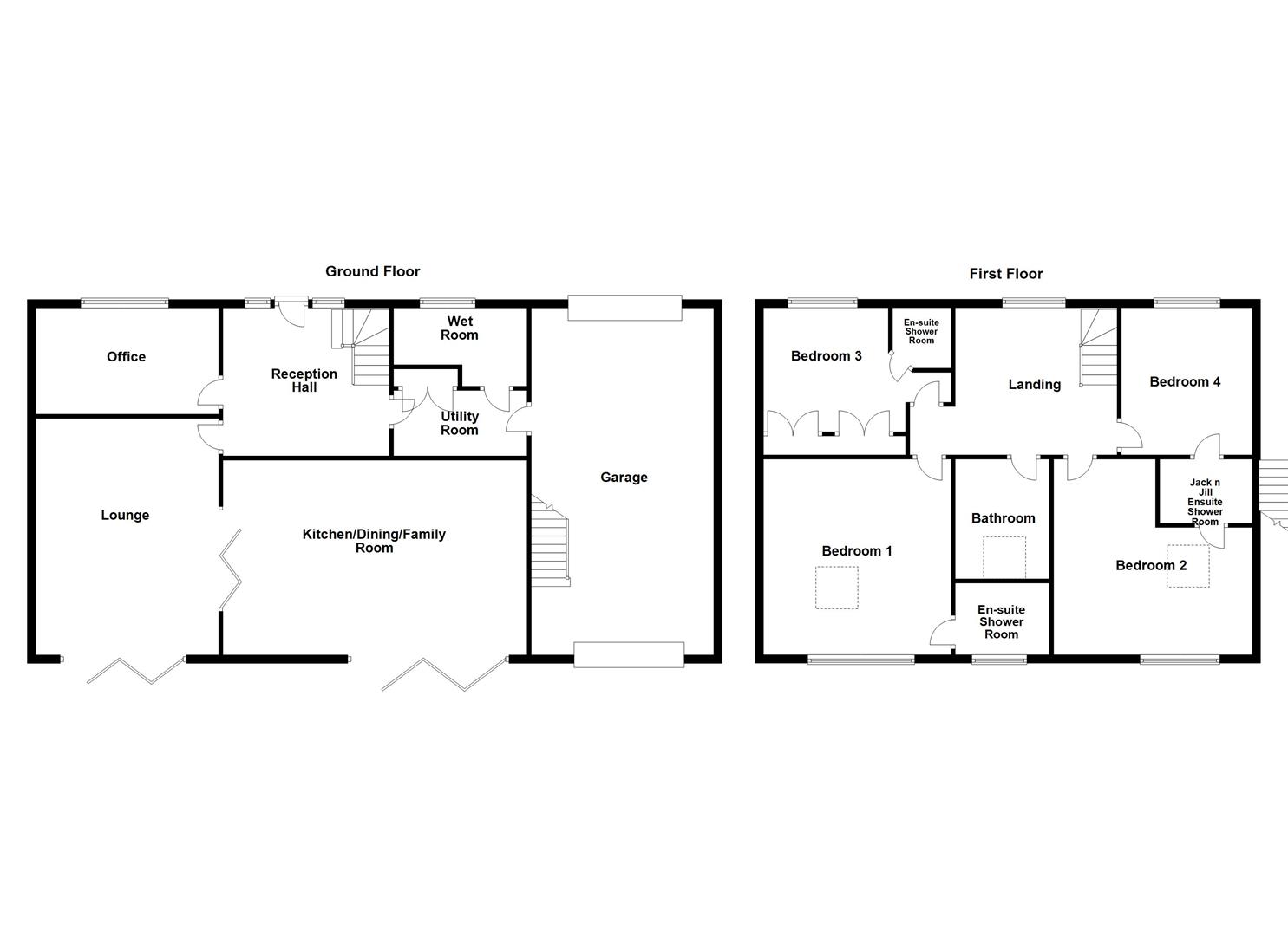 Stairs to the first floor lead to four well proportioned bedrooms with bedroom one and three boasting en suite shower rooms with bedroom two and four with jack and jill en suite shower room/w.c. In addition is a four piece suite house shower room/w.c.