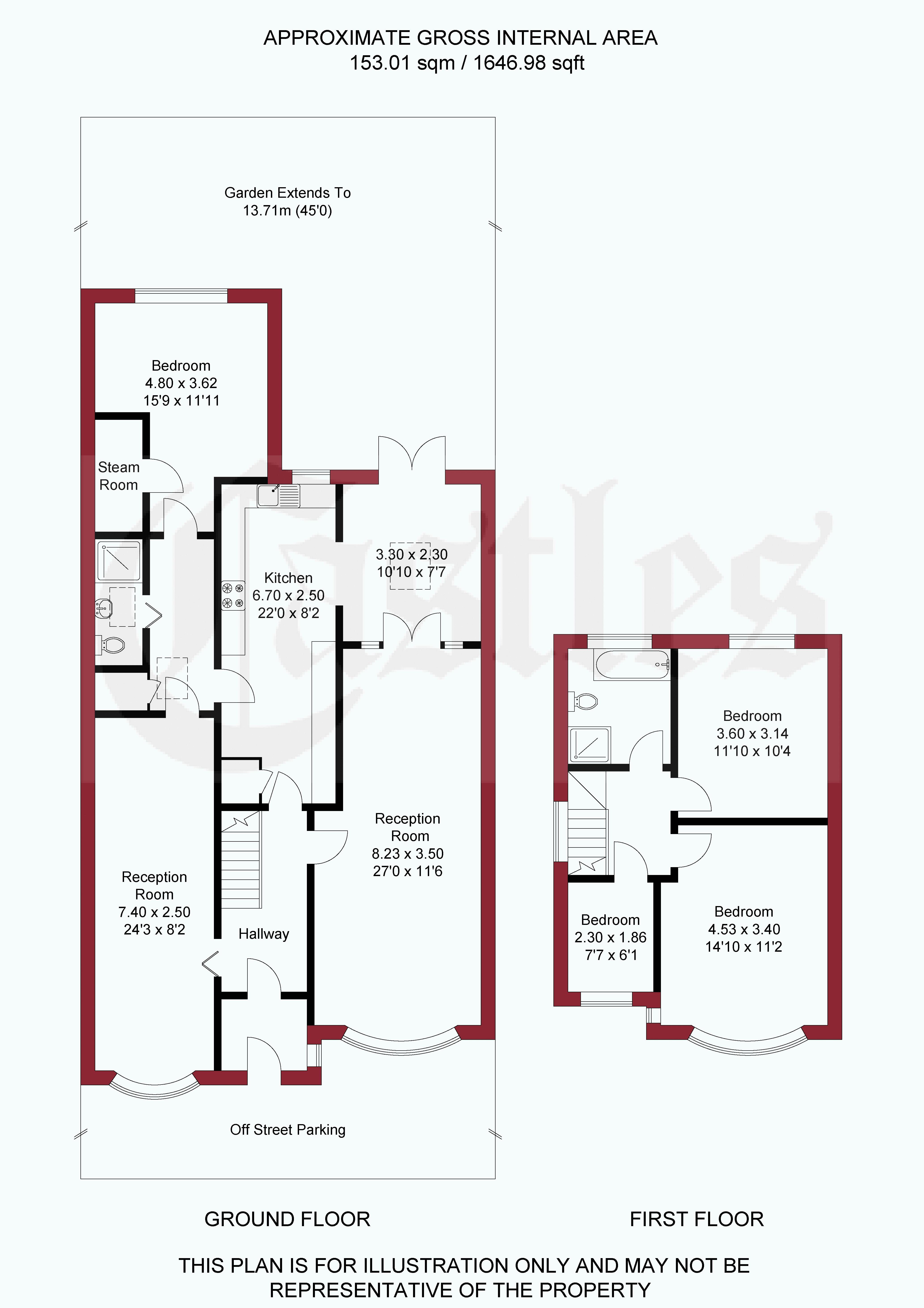 The ground floor comprises a large reception room, an open-plan kitchen/diner, and a practical utility room. There is also a second reception room that leads to a ground floor WC and shower, a steam room, and a ground floor bedroom—ideal for guests or multi-generational living.