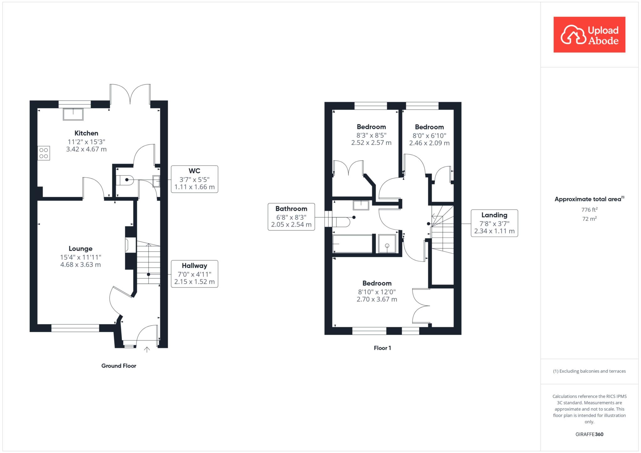 To the rear, the modern kitchen is flooded with natural light from the patio doors and offers both form and function. White cabinetry contrasts beautifully with soft grey countertops and white brick-effect tiles. There`s ample space for dining, making it perfect for everyday living and entertaining. A sleek WC completes the ground floor and features full marble-effect tiles for a luxurious feel.