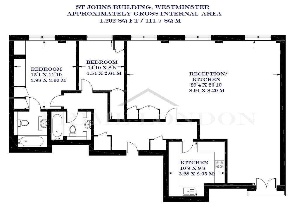 This extremely spacious and bright two-bedroom, two bathroom apartment, with views onto St Johns Gardens, London Eye and House of Parliament. The apartment offers a total of 1,202 sq ft (111.7 sqm) internally of this luxury development in the heart of Westminster, is available to rent through Prime London.