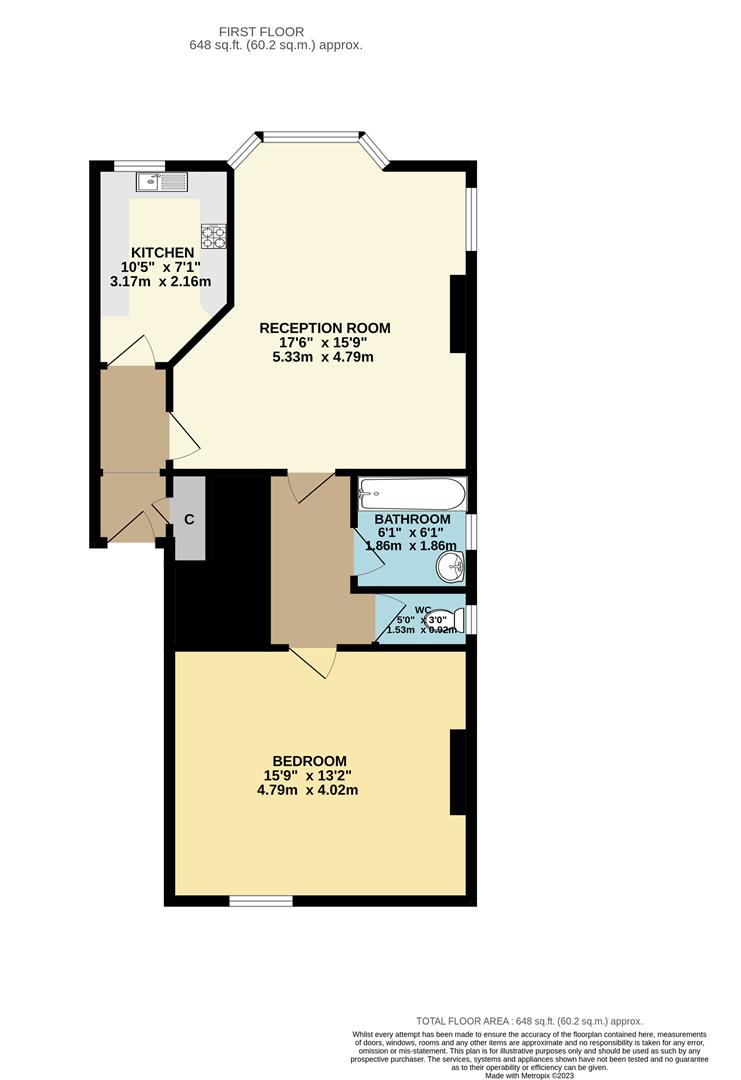 The accommodation includes a large double bedroom with ample space for storage, a bright and spacious lounge/dining room full of natural light and a separate fitted kitchen. The property also benefits from a well-appointed bathroom with a shower over the bath, and a separate WC for added convenience.