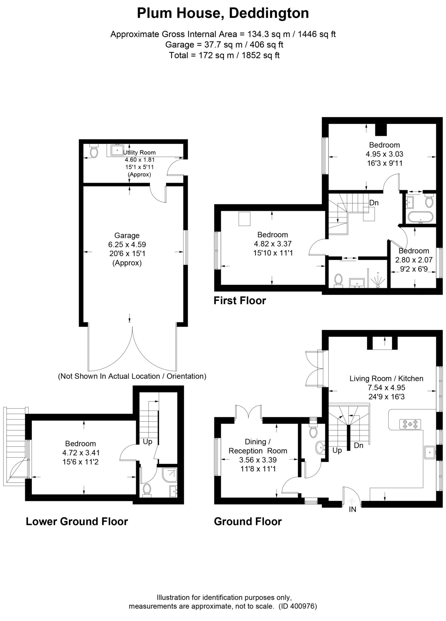 Utility Room (attached to the garage), (4.6 X 1.81 approx) (15`1 X 5`11 approx). Fitted with storage units and work top over along with sink and shelves over. White toilet. Space and plumbing for washing machine and additional appliance. Door to garage.