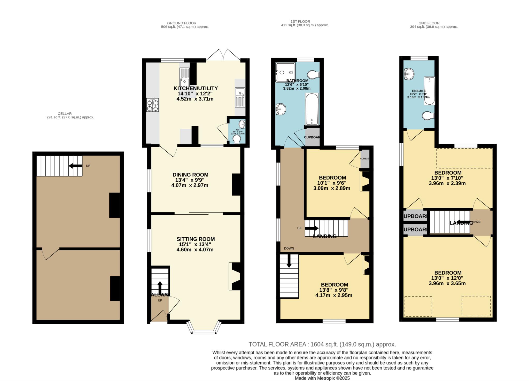 On the ground floor there is a small hallway, a lovely sitting room with a bay window to the front and original fireplace with multi-fuel stove, dining room with access to the cellar, open plan kitchen/utility room with doors opening out onto the garden and a cloakroom. On the first floor you will find a large landing with windows, two double bedrooms and a family bathroom. On the second floor there are a further two bedrooms and another bathroom. There are also two useful cellar rooms. Outside to the rear is a delightful garden with an abundance of mature shrubs, bushes and trees, patio areas ideal for alfresco dining, wildlife pond and a wooden storage shed. The garden is a real delight and a wonderful place to be. At the end of the garden is a large double garage/workshop with light, power and an inspection pit. To the front of the garage is a parking area providing additional off road parking should you need it.