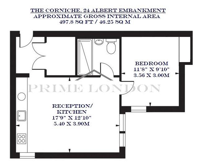 The 497 sq ft / 46.25 sq m property comprises a modern open plan reception and kitchen with large window offering views of the River Thames, a spacious double bedroom with ample storage, separate family bathroom, and plenty of further storage in the hall.