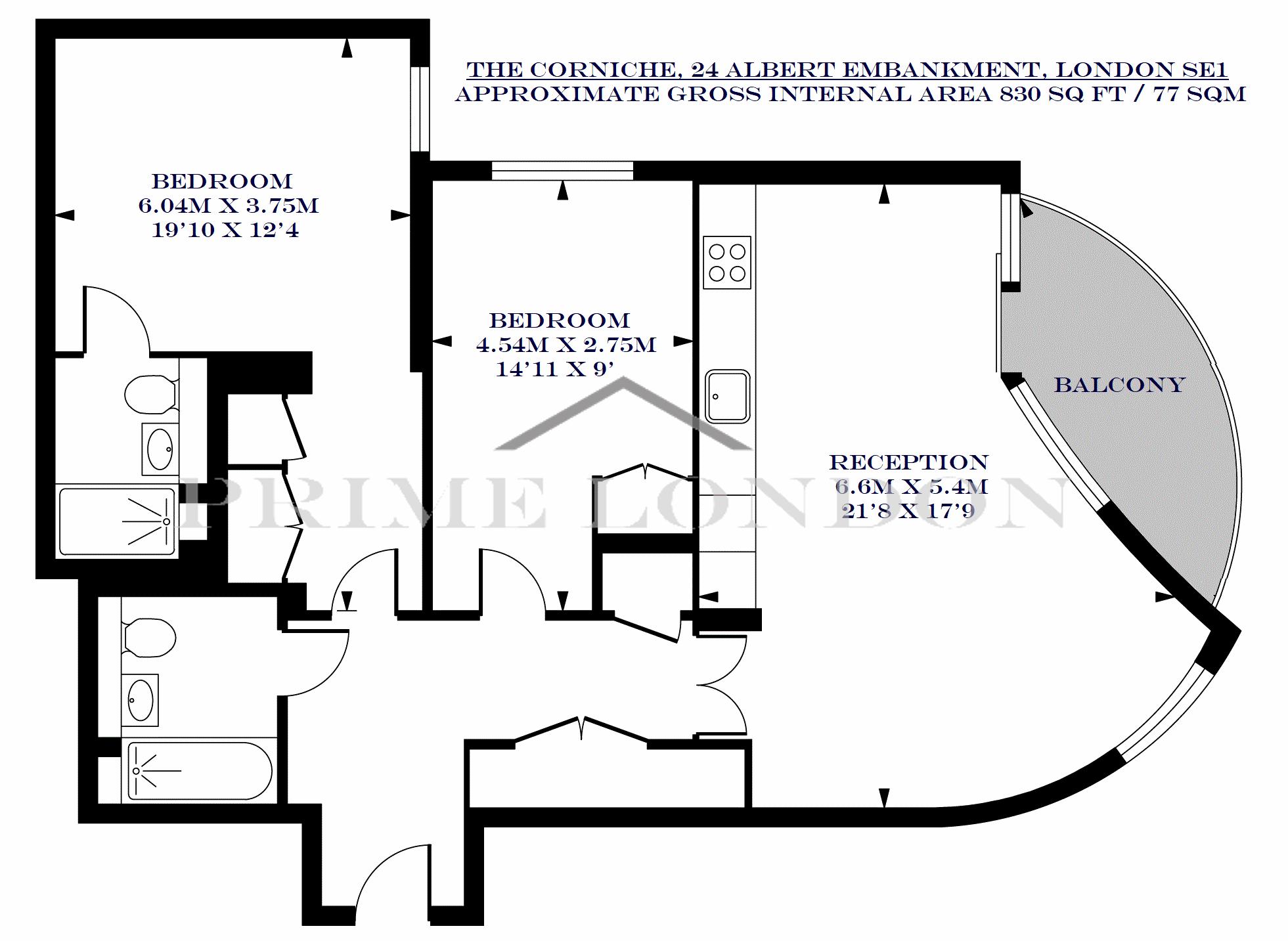 A modern river facing two bedroom two bathroom apartment of 842.1 sq ft (78.24 sqm) available for lease in The Corniche through Prime London.