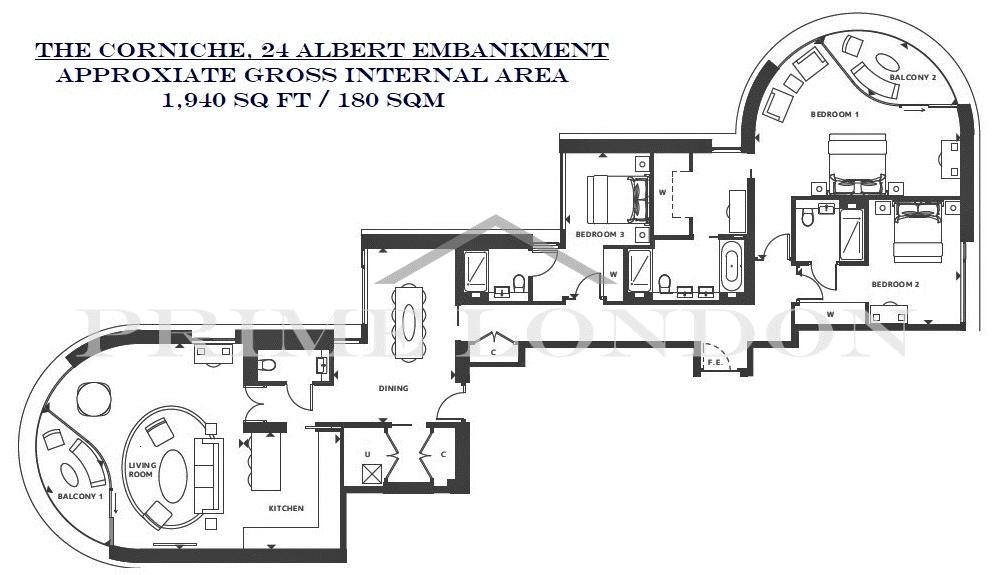 An elite collection triple aspect three bedroom apartment of 1,940 sq ft (180 sqm), with secure parking, two entrances and exquisite specifications, available in The Corniche exclusively through Prime London.